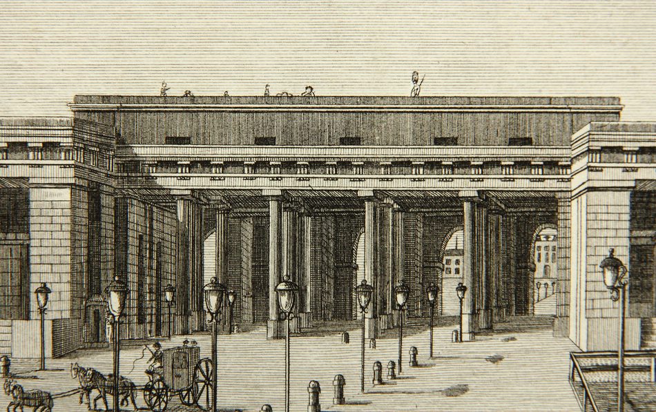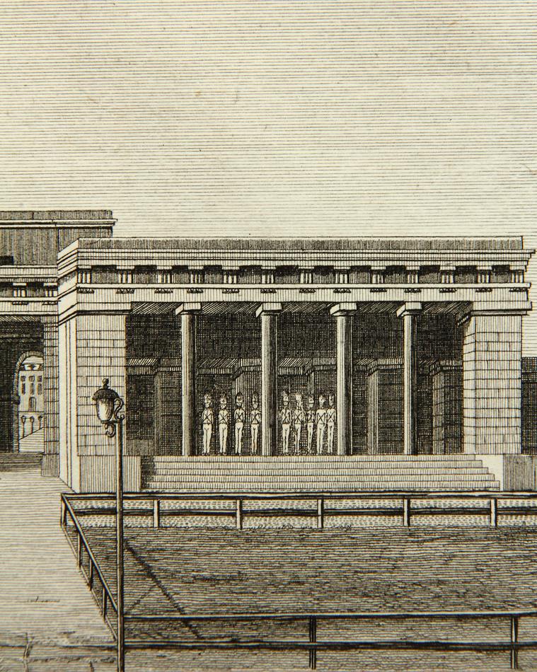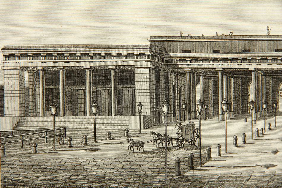 - Description: In 1824, the new Burgtor at the Vienna Hofburg was ceremoniously opened. Built from 1821 onwards according to plans by Luigi Cagnola (1762 Milan – 1833 Inverigo), it closes off Heldenplatz in the direction of today’s Ringstrasse. The historical depiction of the neoclassical “Heroes’ Gate” shows the architecture with fine details as well as an imperial guard in the colonnades and a horse-drawn carriage on the street in front of the gate.