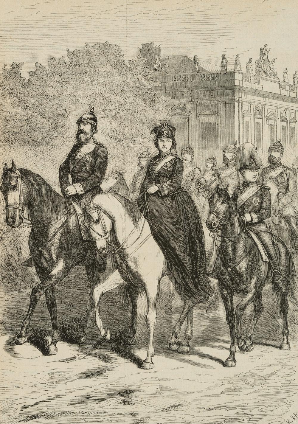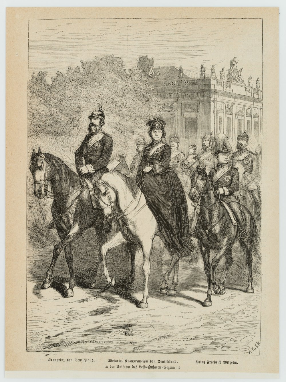 - Description: Showing the ride of Crown Princess Victoria of Great Britain and Ireland (1840-1901) in the uniform of the Leib=Husaren=Regiment with family and retinue in Berlin.