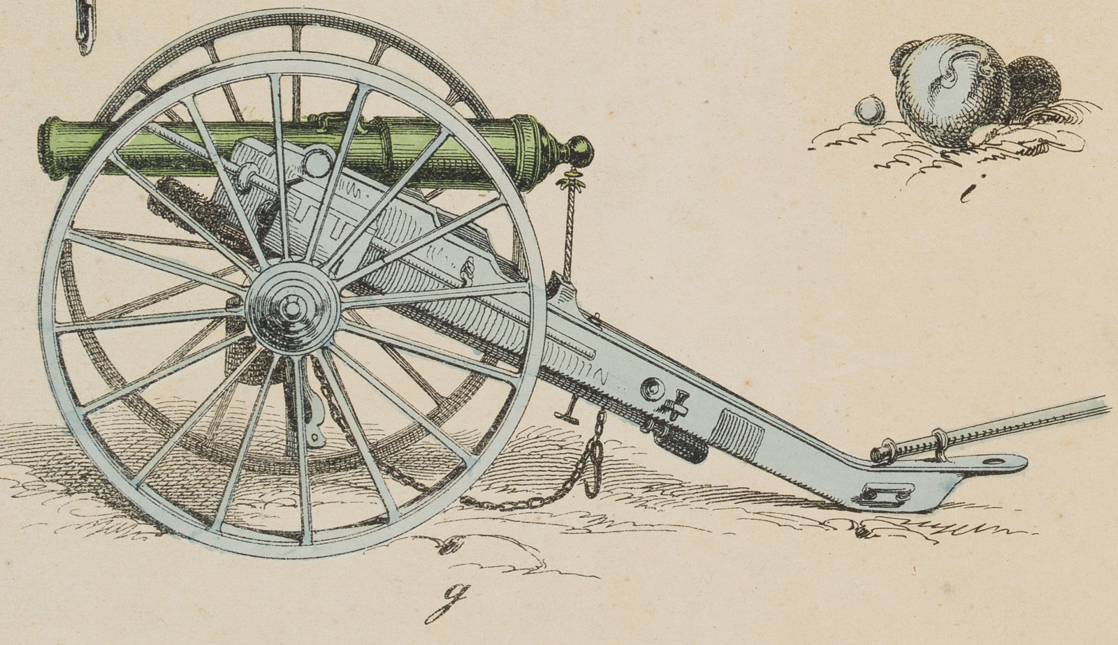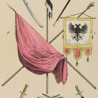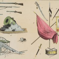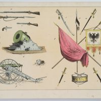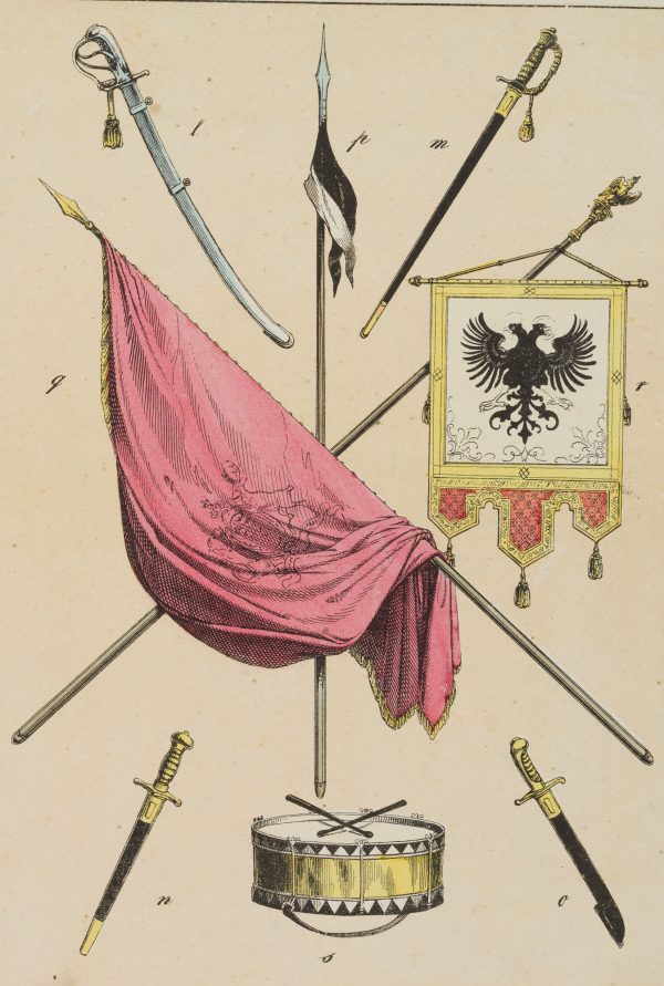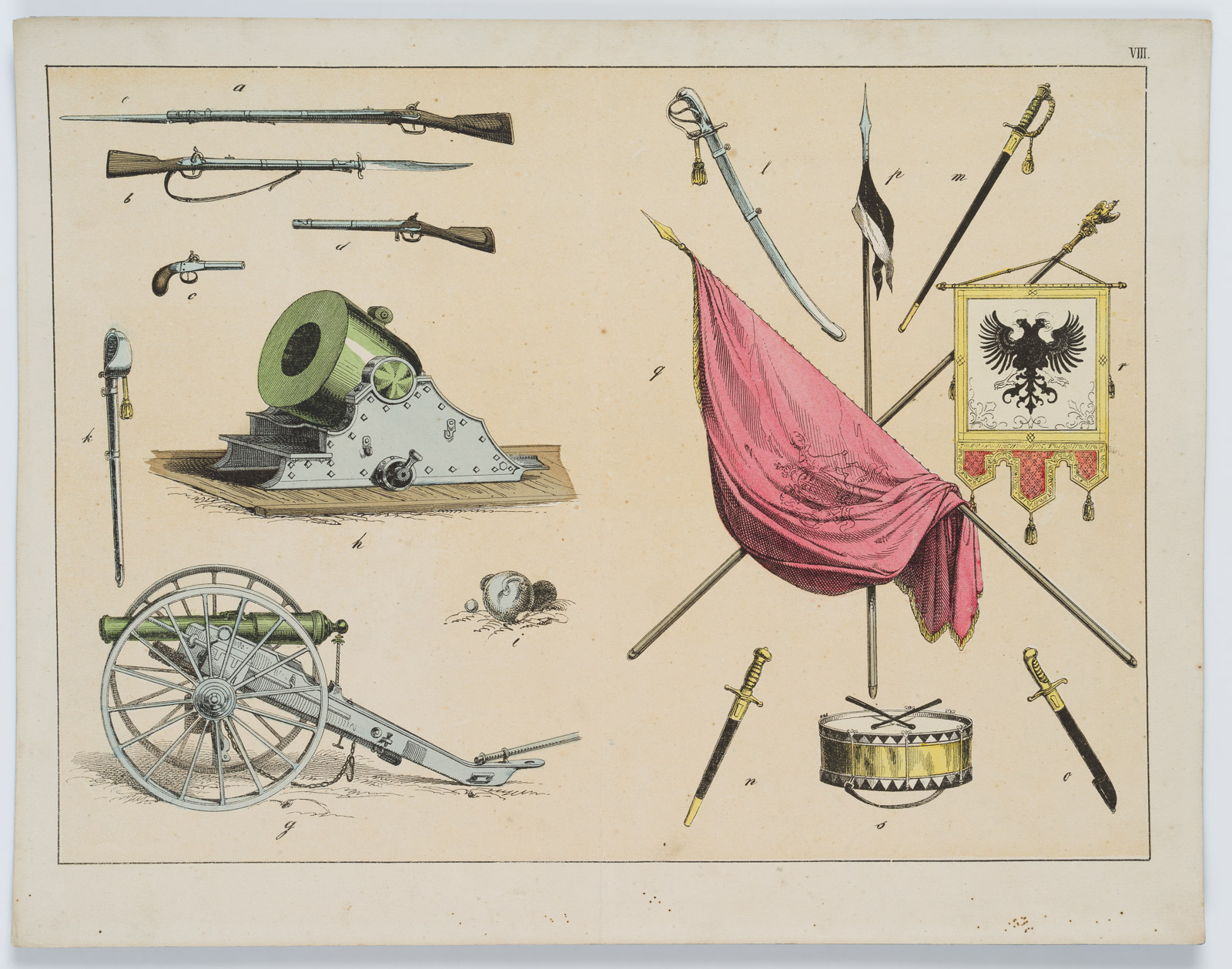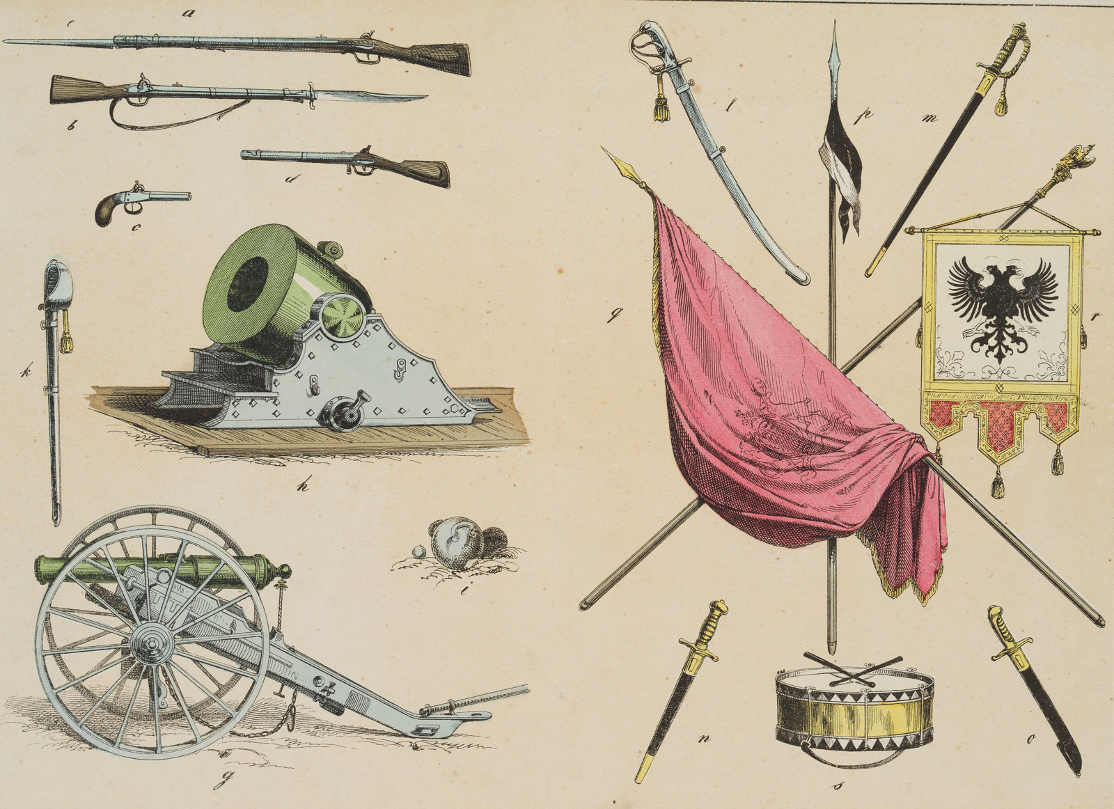Unbekannt (19. Jahrhundert), Waffen und Ausrüstungsstücke einer Armee: Degen, Säbel, Kanonen, Schwerter, Wappen, Blechtrommel, Fahnen. Anschauungsblätter einer Enzyklopädie, um 1900, Federlithographie