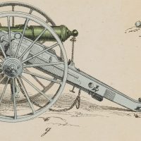 Unknown (19th century), Weapons and equipment of an army: swords, sabres, cannons, swords, coats of arms, tin drums, flags Illustrative sheets of an encyclopaedia, c. 1900, Lithography with pen