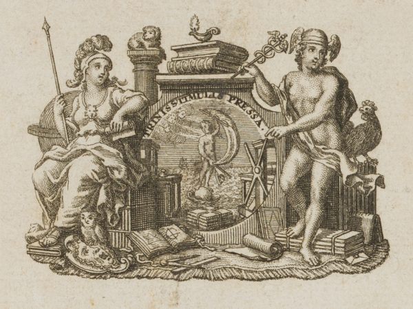 Unknown (19th century), Aux depens de la compagnie’ Frontispiece with mythological gods Portrait of the birth of Venus flanked by Minerva and Hermes, 19th century, Copper engraving
