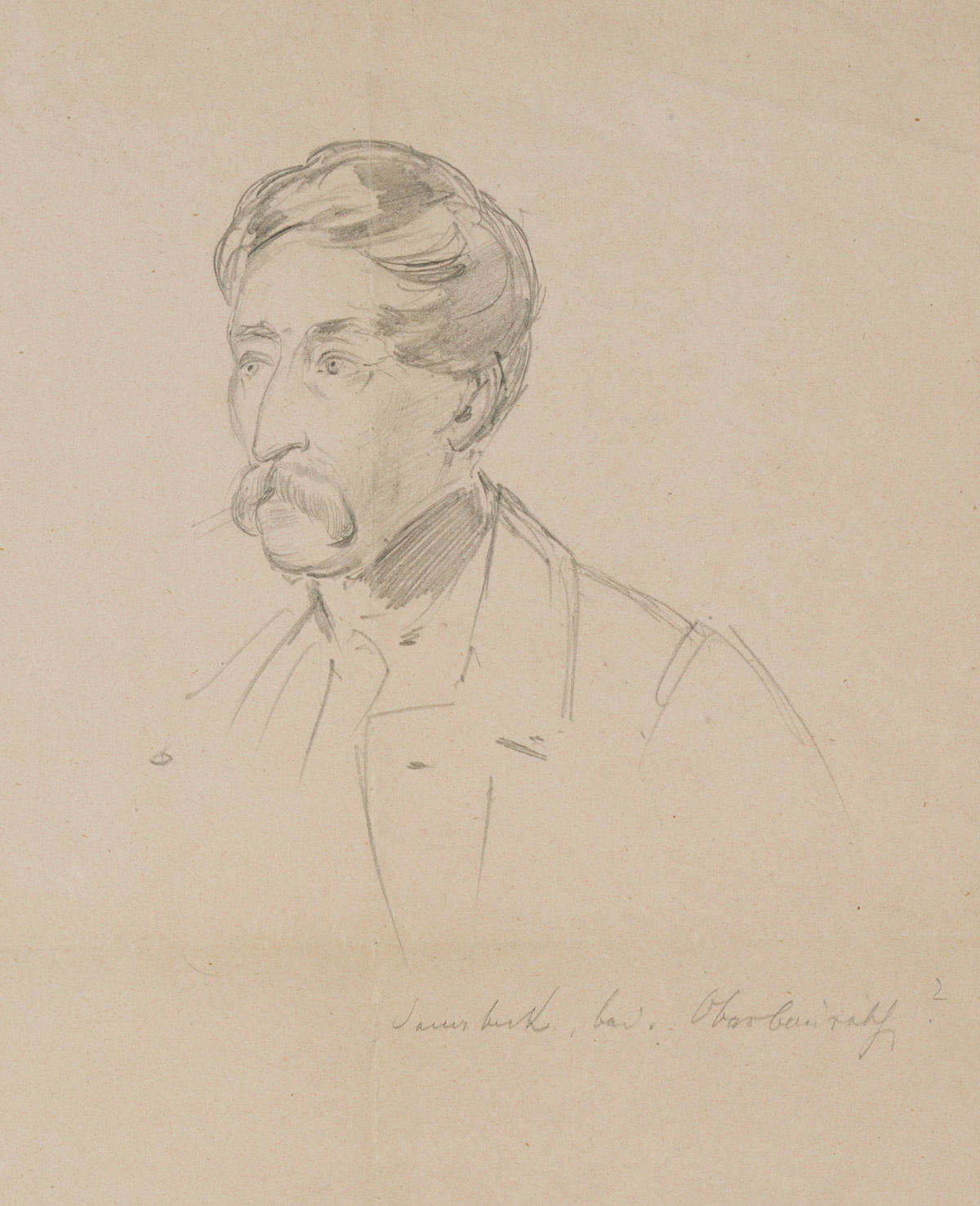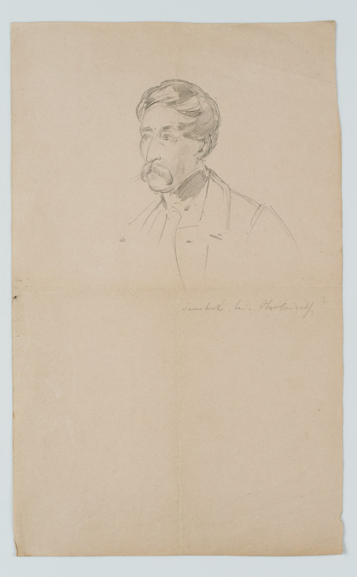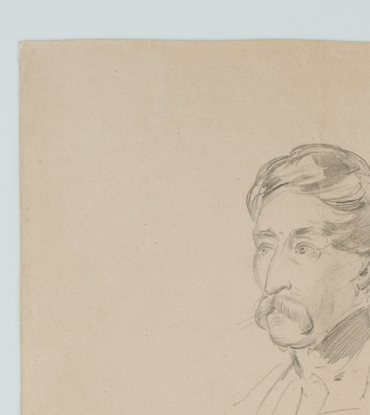 • Beschreibung: Skizzenhaft und mit schnellen Strichen gezeichnete Porträtskizze eines schnaubärtigen Mannes als Brustbild im Halbprofil.