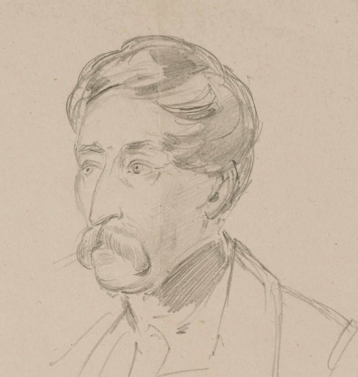 Skizzenhaft und mit schnellen Strichen gezeichnete Porträtskizze eines schnaubärtigen Mannes als Brustbild im Halbprofil.