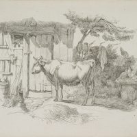 - Description: In front of a wooden stable or shed in the middle ground, numerous animals have gathered in the foreground. A cow forms the centre of the depiction, its gaze falling on a sleeping cat that appears to be sleeping on a wooden barrel at the left edge of the picture. Inverted milk jugs can be seen in the right-hand middle ground, drying on sticks. Five chickens complete the scenery, sitting on a branch or brooding, they are surrounded by little chicks.