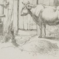 - Beschreibung: Vor einem hölzernen Stall oder Verschlag im Mittelgrund haben sich im Vordergrund zahlreiche Tiere eingefunden. Eine Kuh bildet das Zentrum der Darstellung, ihr Blick fällt auf eine schlafende Katze, die auf einem hölzernen Fass am linken Bildrand zu schlafen scheint. Umgedrehte Milchkrüge sind im rechten Mittelgrund zu erkennen, die auf Stöcken trocknen. Fünf Hühner ergänzen die Szenerie, auf einem Ast sitzend oder brütend, werden sie von kleinen Küken umringt.