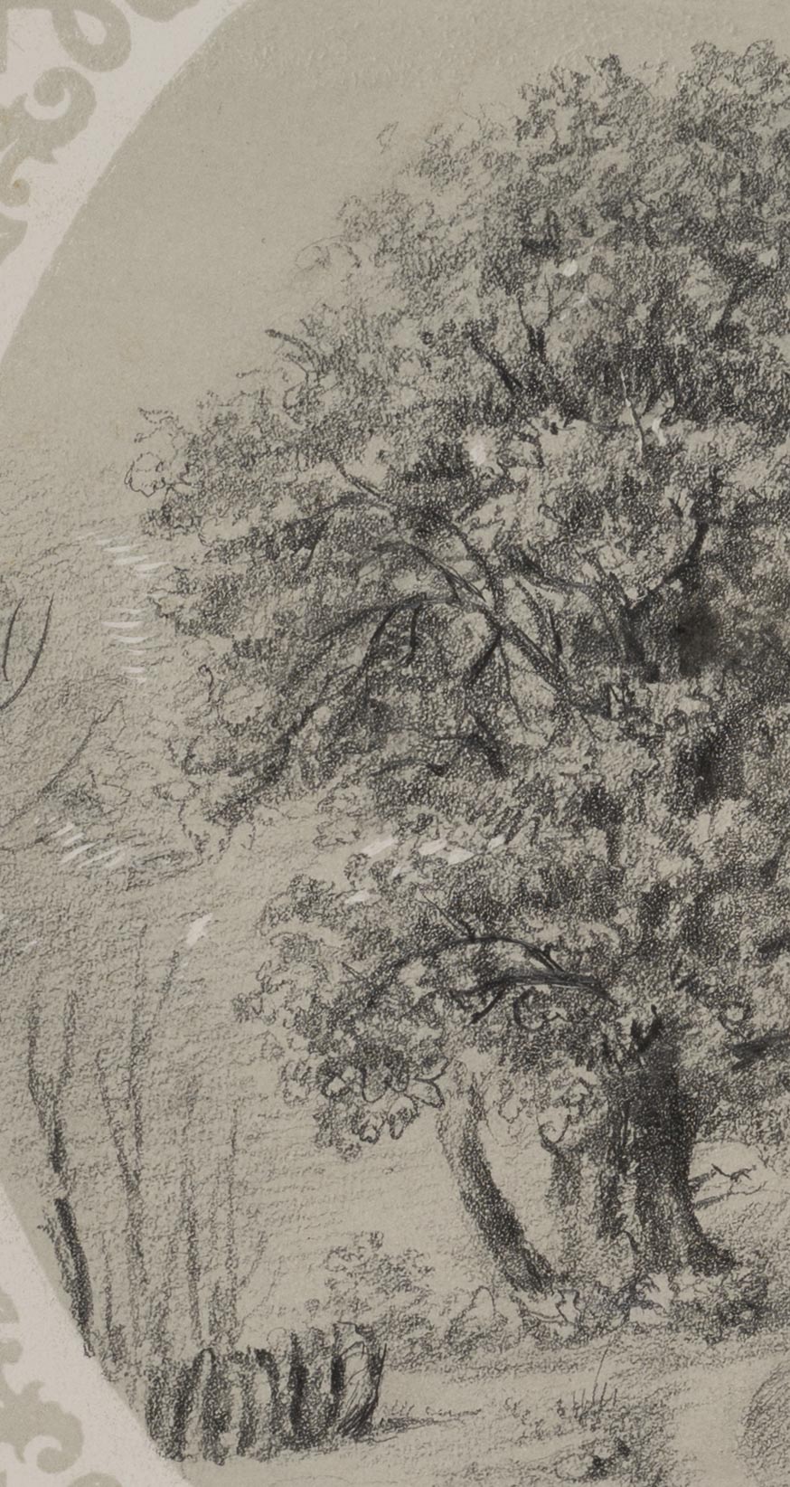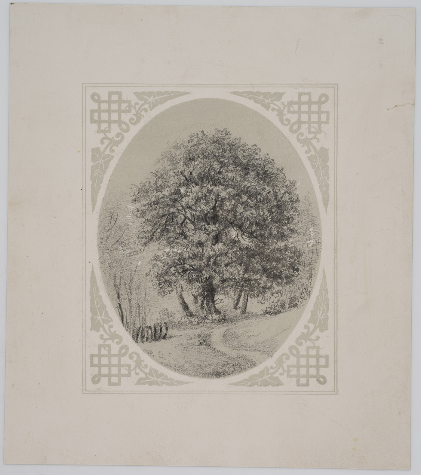 • Description: Without designation. Following a narrow path, the viewer catches sight of a small group of trees in the middle ground of the depiction. The trunk and branches of the probably largest tree are attentively rendered.