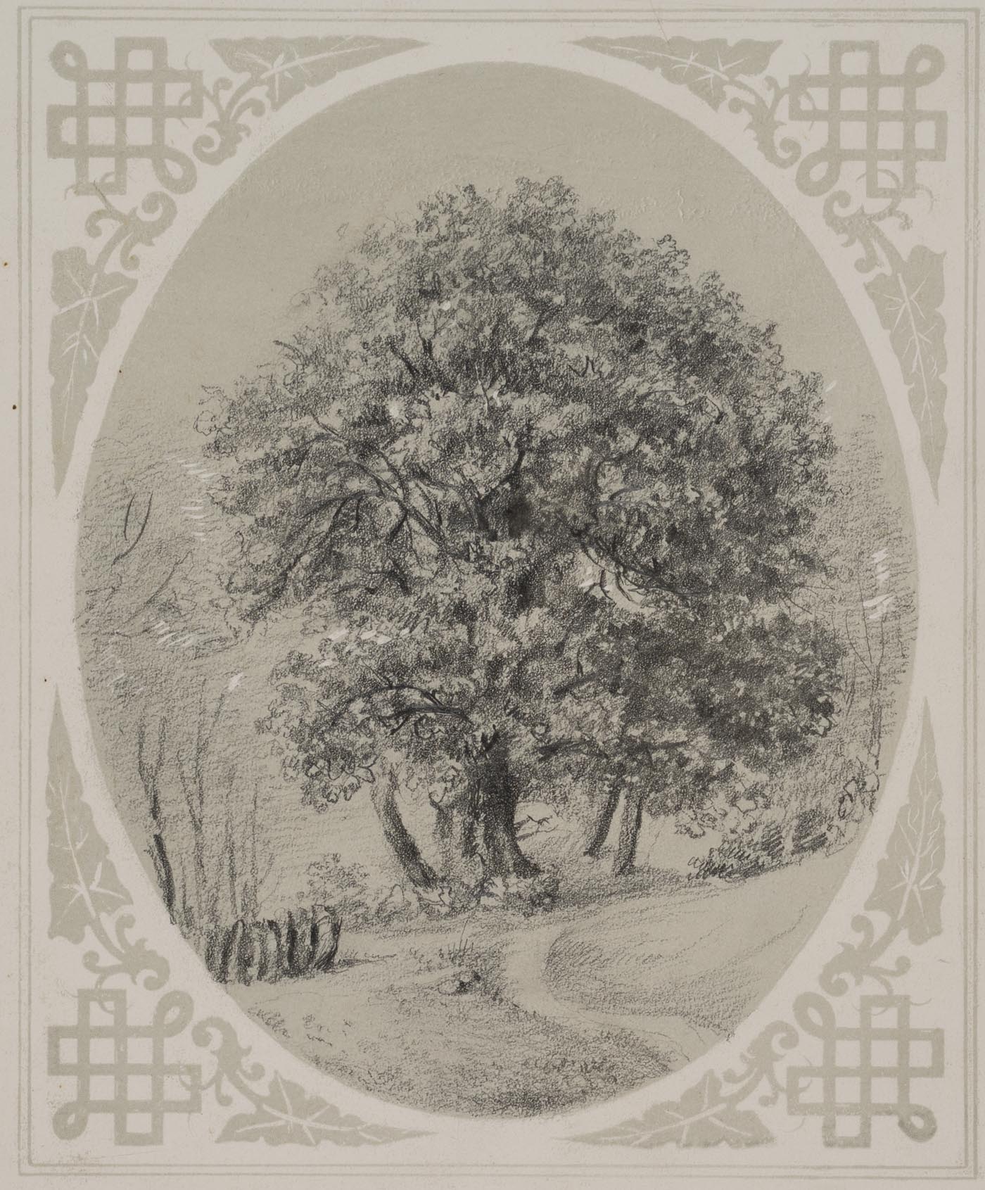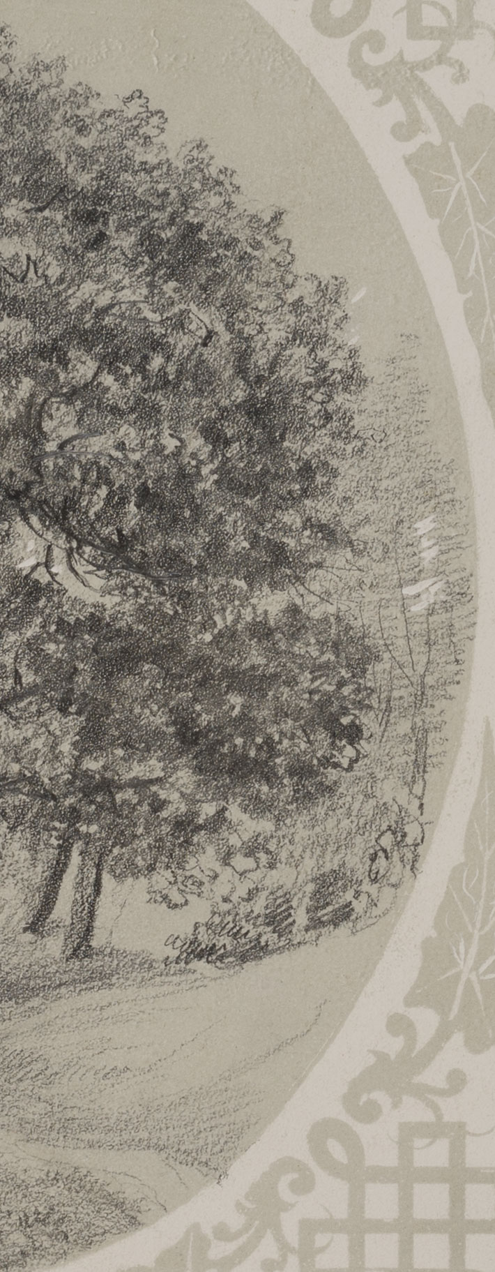 • Beschreibung: Ohne Bezeichnung. Einem schmalen Pfad folgend, erblicken die Betrachtenden im Mittelgrund der Darstellung eine kleine Baumgruppe. Der Stamm und das Geäst des wohl größten Baumes sind aufmerksam wiedergegeben.