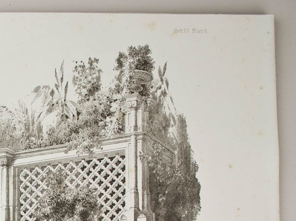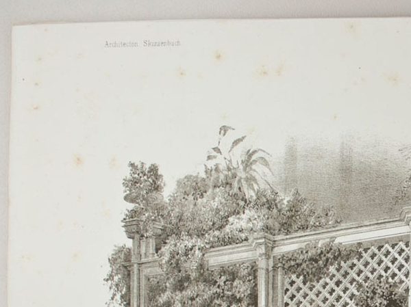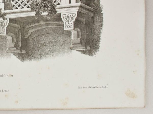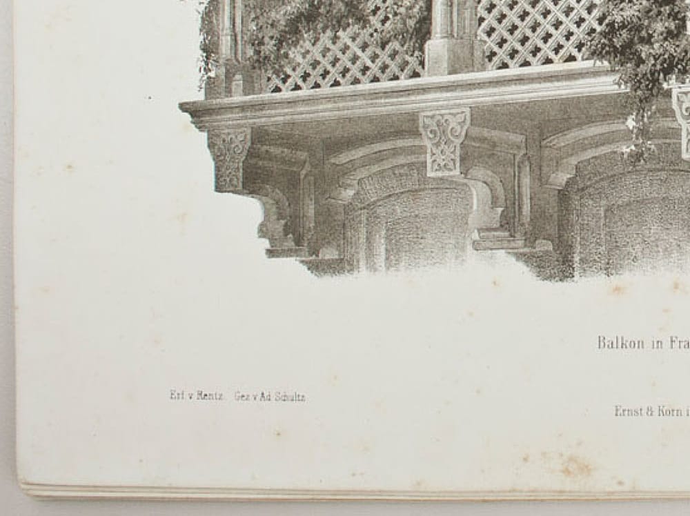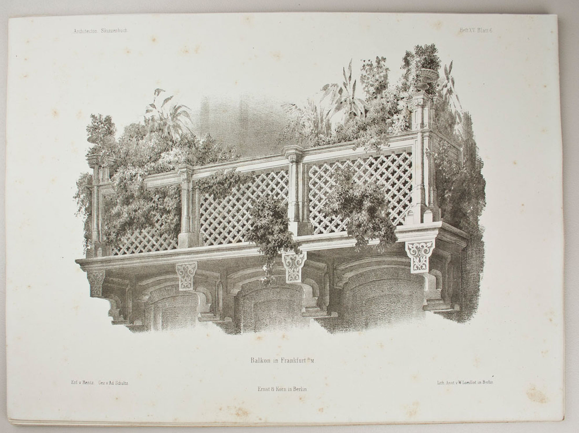 - Description: 1st balcony in Frankfurt a /M. Lithograph (1860-1866). Lith. Anst. v. W. Loeillot in Berlin. Invented by Rentz. Gez. v. Ad. Schultz. Booklet XV. sheet 6. size of the sheet: 25 x 34,5 cm. From the Architectonisches Skizzenbuch published by Ernst & Korn in Berlin. This is ?La Tête de collection ? the French edition of this contemporary German architecture. The text pages were translated and printed in Paris. The first French edition (July 1860) corresponds with issue 41 of the German edition. The designs are in good condition, the sheet has minor age spotting.