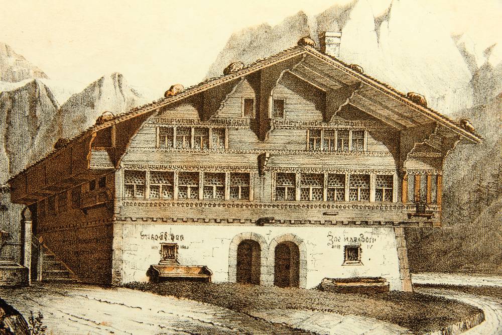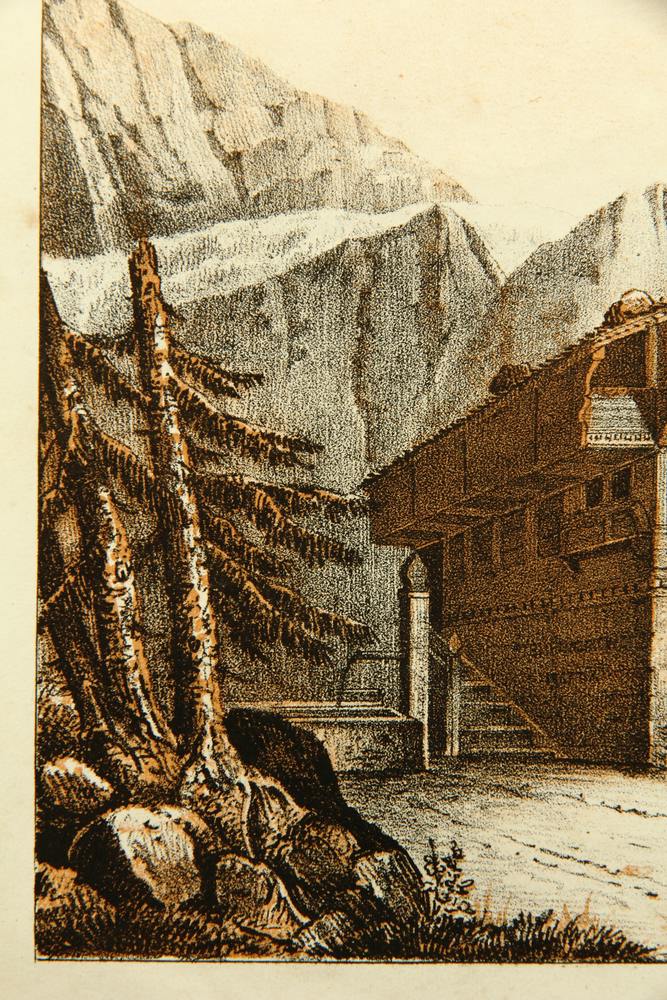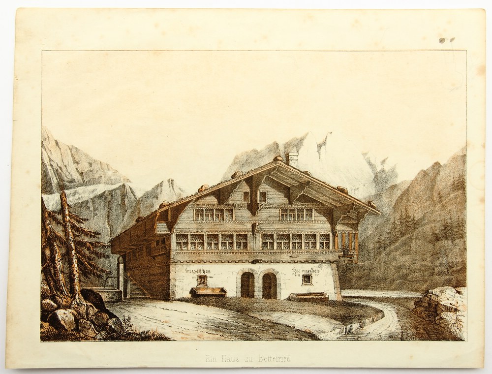 Unbekannt (19. Jahrhundert), Bauernhaus in alpiner Gebirgslandschaft bei Bettelried in der Schweiz, 19. Jahrhundert, Lithographie