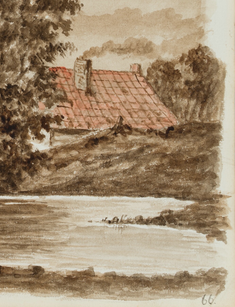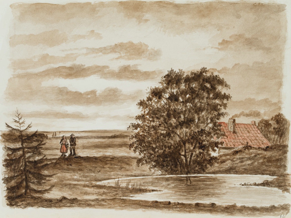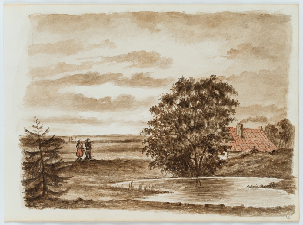 - Beschreibung: An einem kleinen Weiher in einer weiten Ebenenlandschaft ist versteckt hinter einem Baum eine Kate zu sehen. Links steht, beinahe wie für ein Foto posierend, ein Bauernpaar vor der weiten offenen Landschaft. Die Darstellung besticht durch ihre reduzierte Farbigkeit in Sepiatönen mit einzelnen blassroten Akzenten. Das Werk stammt aus dem Skizzenbuch eines unbekannten französischen Künstlers, der Mitte des 19. Jahrhunderts in den Niederlanden, Belgien, Norddeutschland und der Rheingegend unterwegs war und insbesondere holländische, flämische und norddeutsche Landschaften festgehalten hat. Dabei zeigt er den Alltag der Bewohner an den großen und kleinen Flüssen sowie Einblicke in Stadtlandschaften der Nordsee-Region.