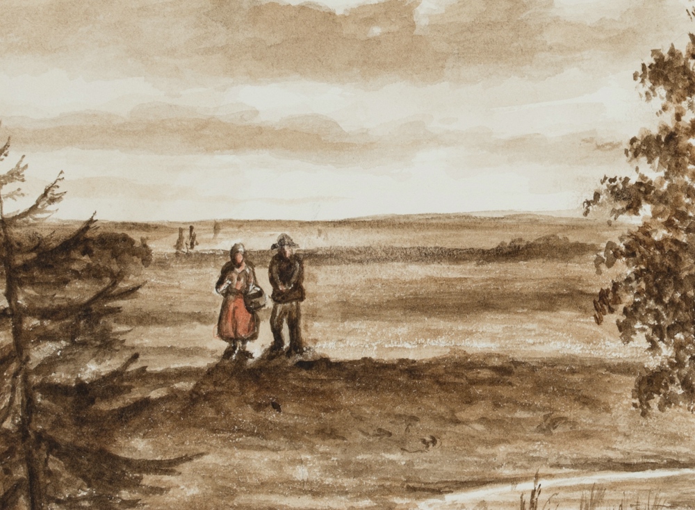 - Description: At a small pond in a wide plain landscape, a croft can be seen hidden behind a tree. On the left, almost as if posing for a photograph, a peasant couple stands in front of the wide open landscape. The depiction is captivating because of its reduced colours in sepia tones with individual pale red accents. The work comes from the sketchbook of an unknown French artist who travelled in the Netherlands, Belgium, northern Germany and the Rhine region in the mid-19th century, capturing in particular Dutch, Flemish and northern German landscapes. In doing so, he shows the everyday life of the inhabitants along the large and small rivers as well as glimpses of cityscapes in the North Sea region.