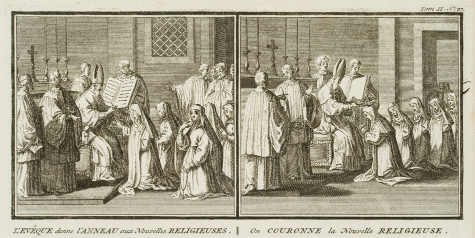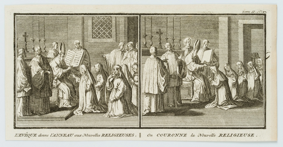 - Description: In these two finely crafted views of a religious ceremony, the moment is captured as the young nun receives her ring and is subsequently crowned. Inscribed at the bottom: “L’EVêQUE donne l’ ANNEAU aux Nouvelles RELIGIEUSES.II On COURONNE la Nouvelle RELIGIEUSE.”