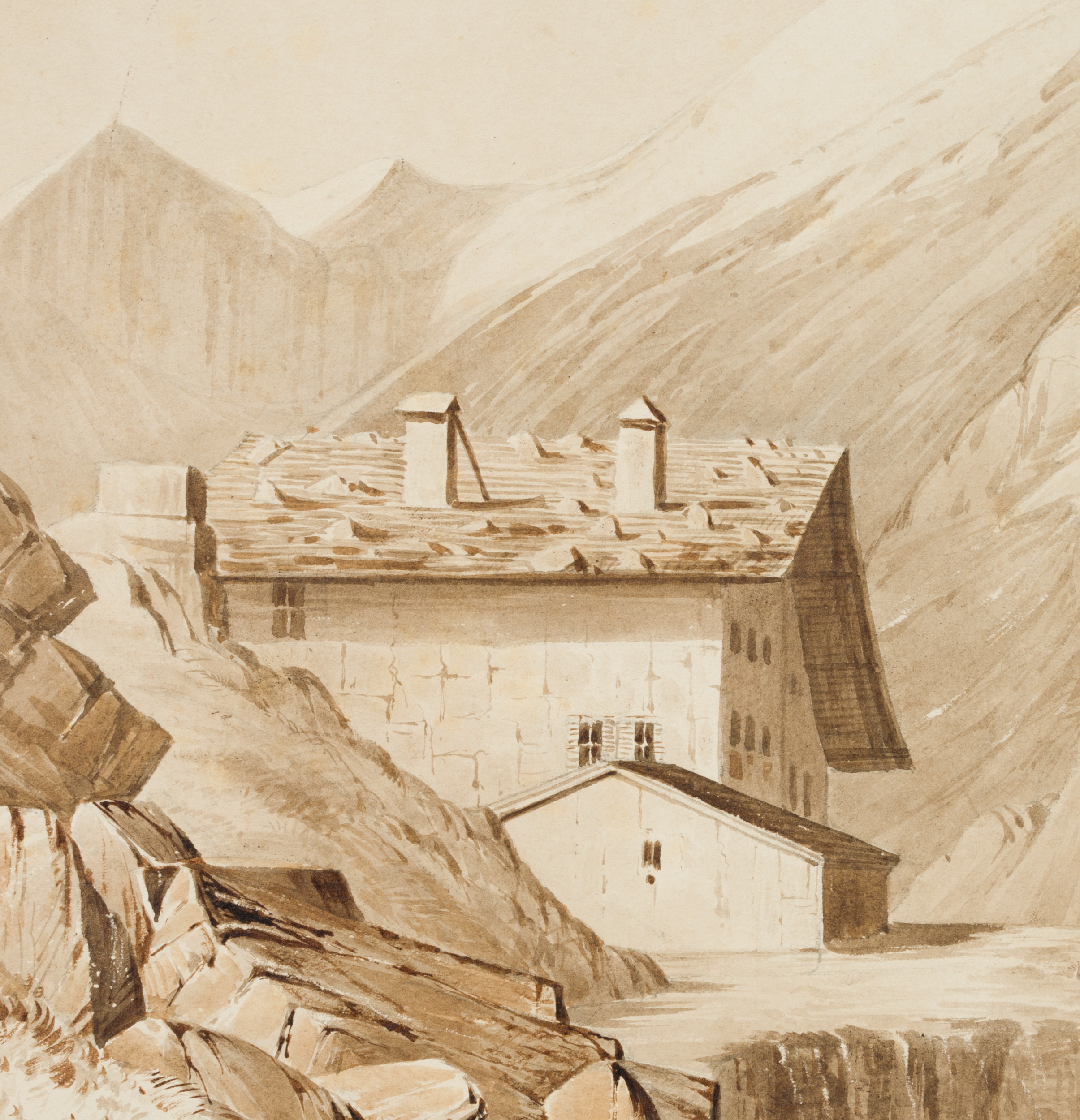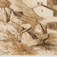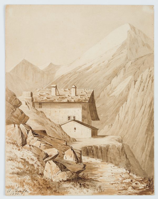 Unknown (19th century), Mountain inn in alpine mountains, 1870, Brush drawing