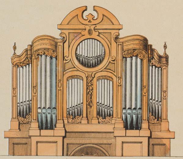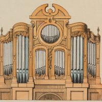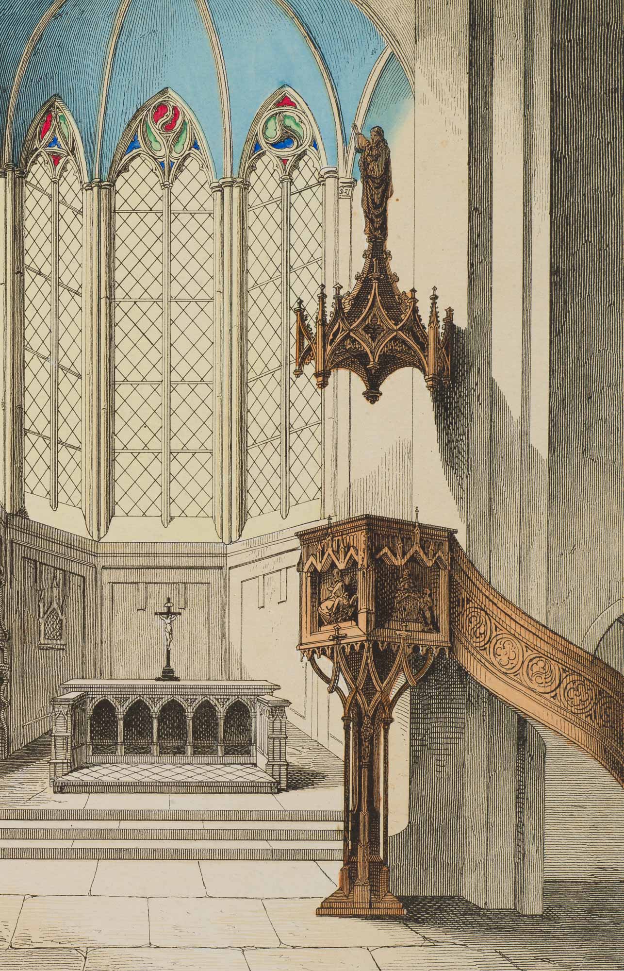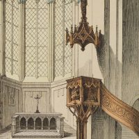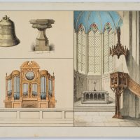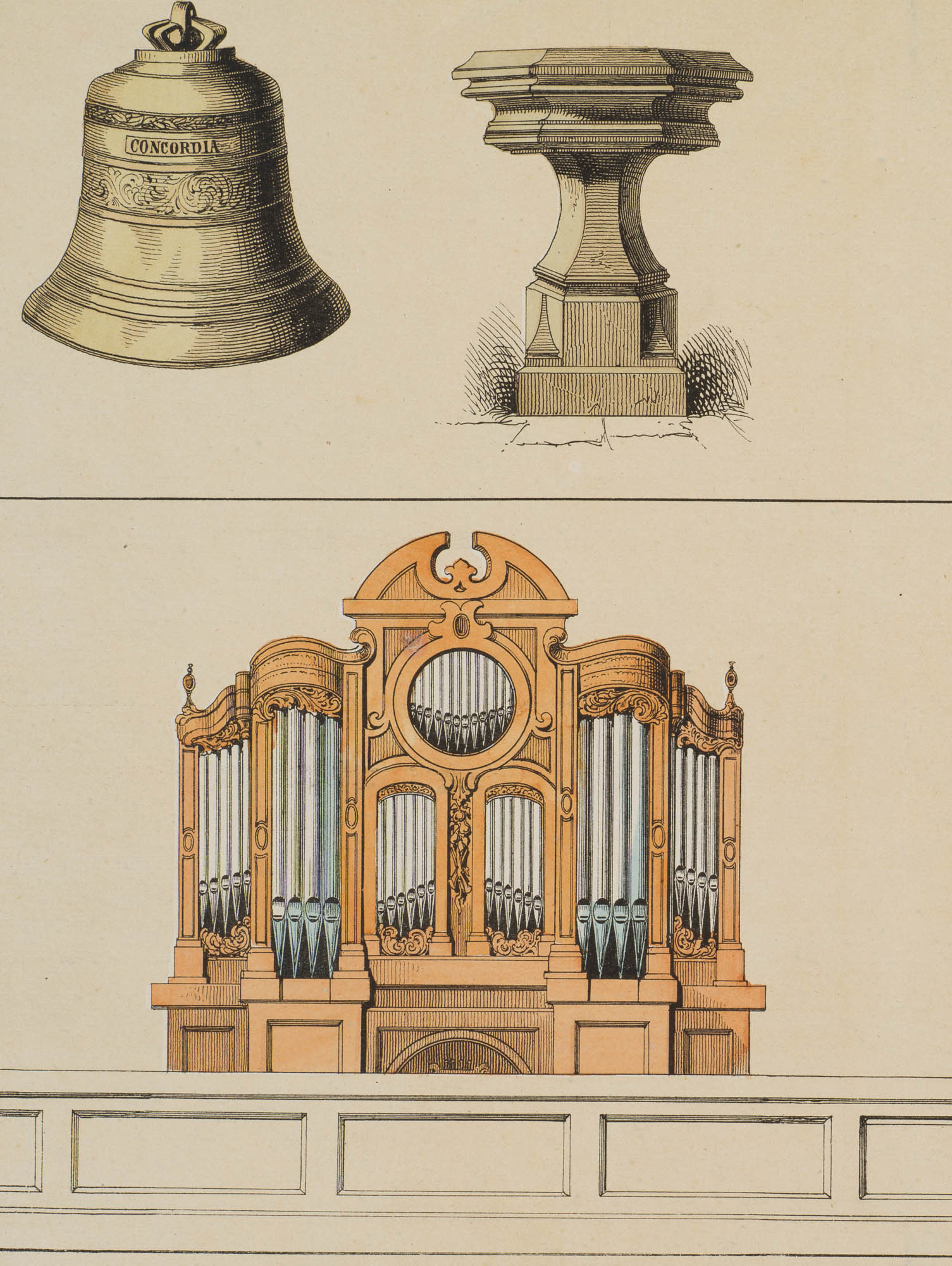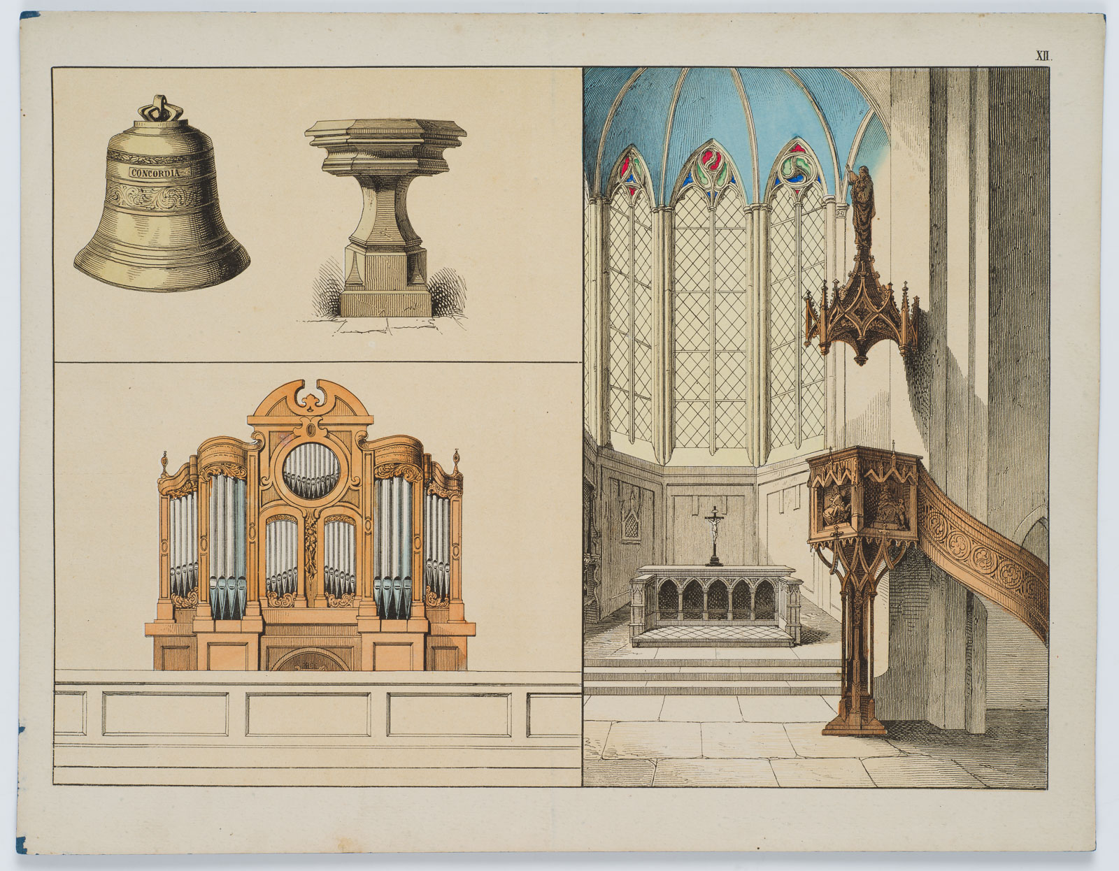Unknown (19th century), Components of a church: bell, baptismal font, organ, view into the choir with pulpit and altar Illustrative sheets of an encyclopaedia, c. 1900, Lithography with pen