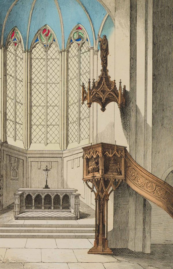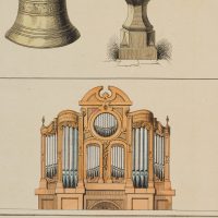 Unbekannt (19. Jahrhundert), Bestandteile einer Kirche: Glocke, Taufbecken, Orgel, Blick in den Chor mit Kanzel und Altar. Anschauungsblätter einer Enzyklopädie, um 1900, Federlithographie