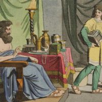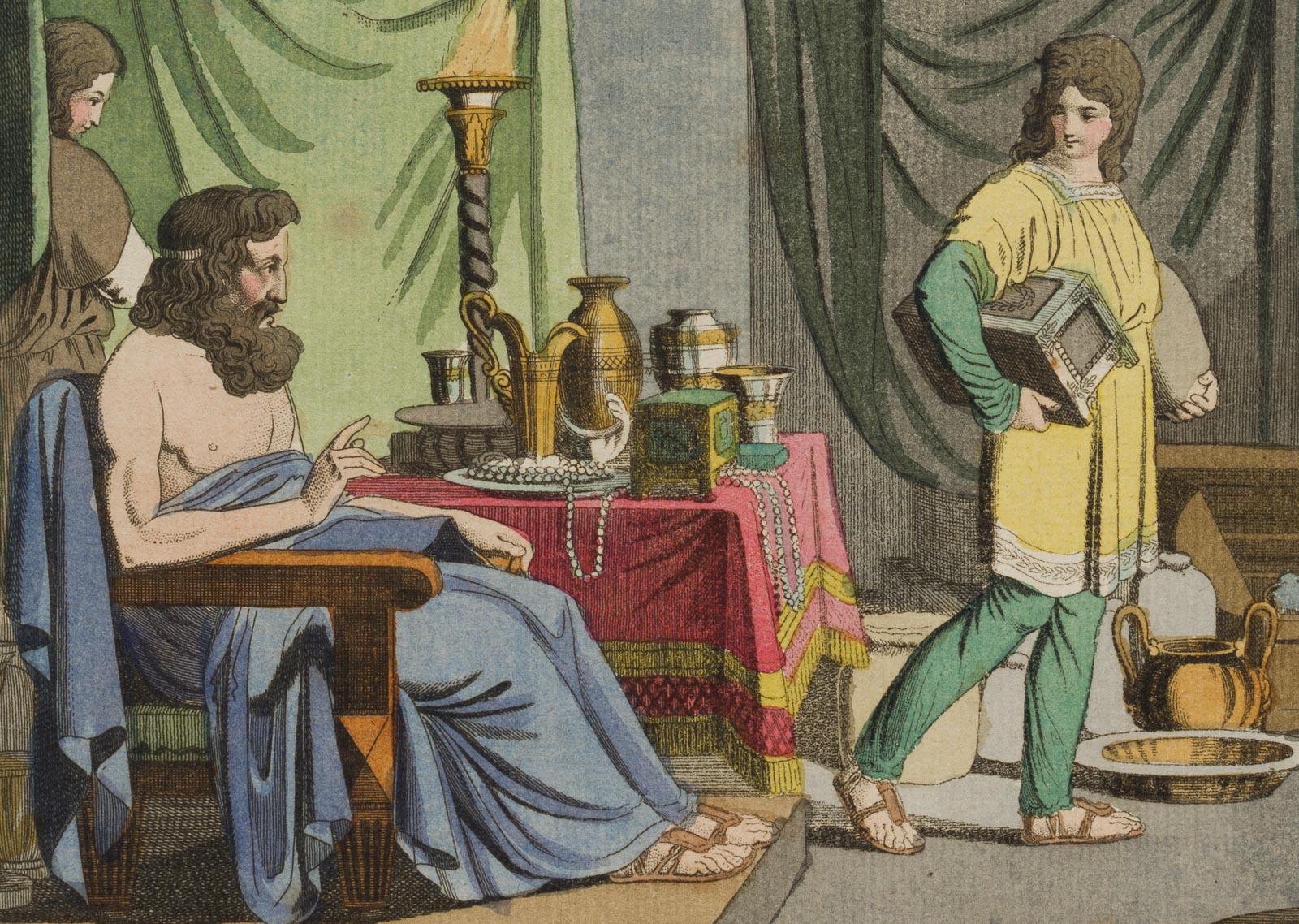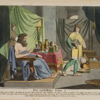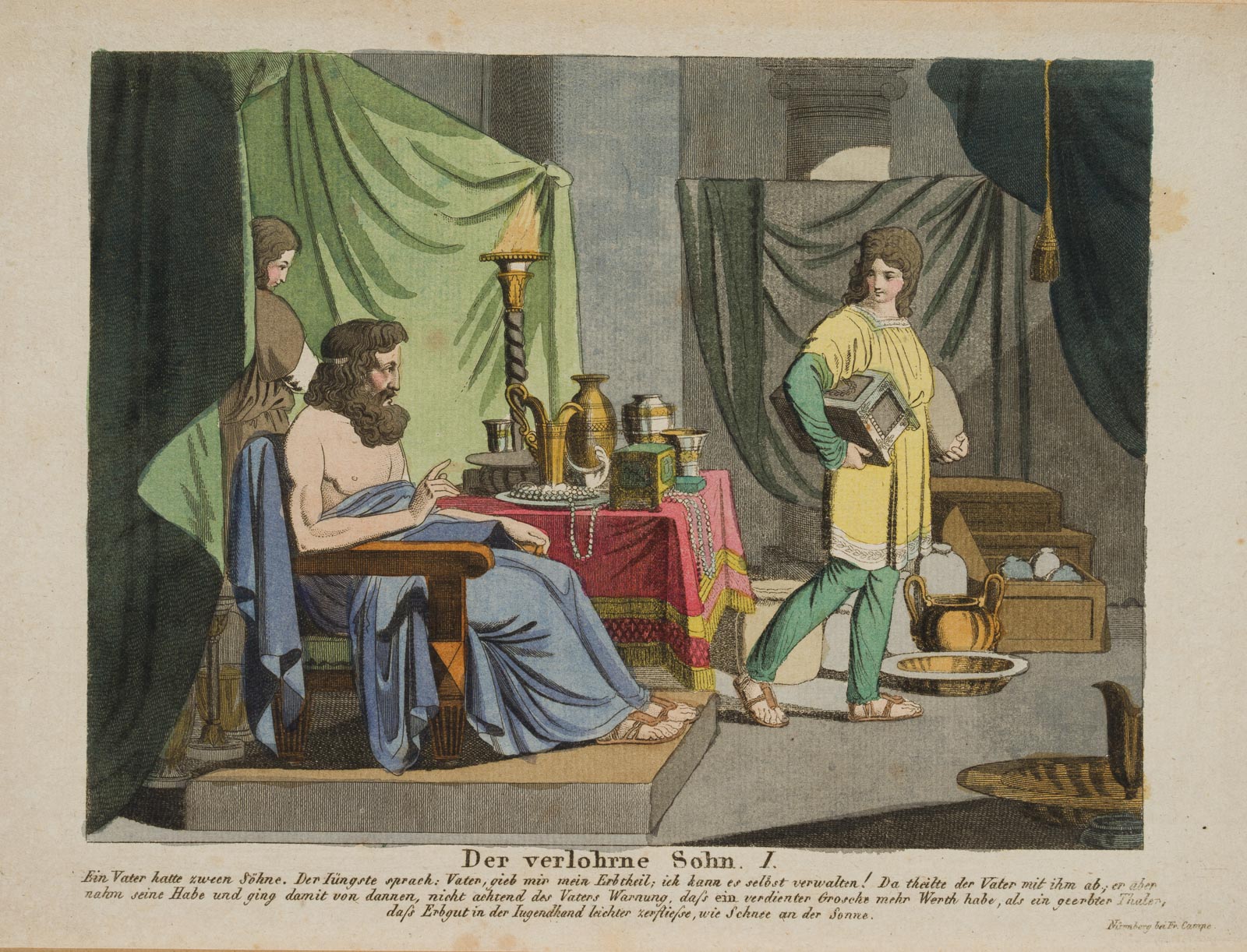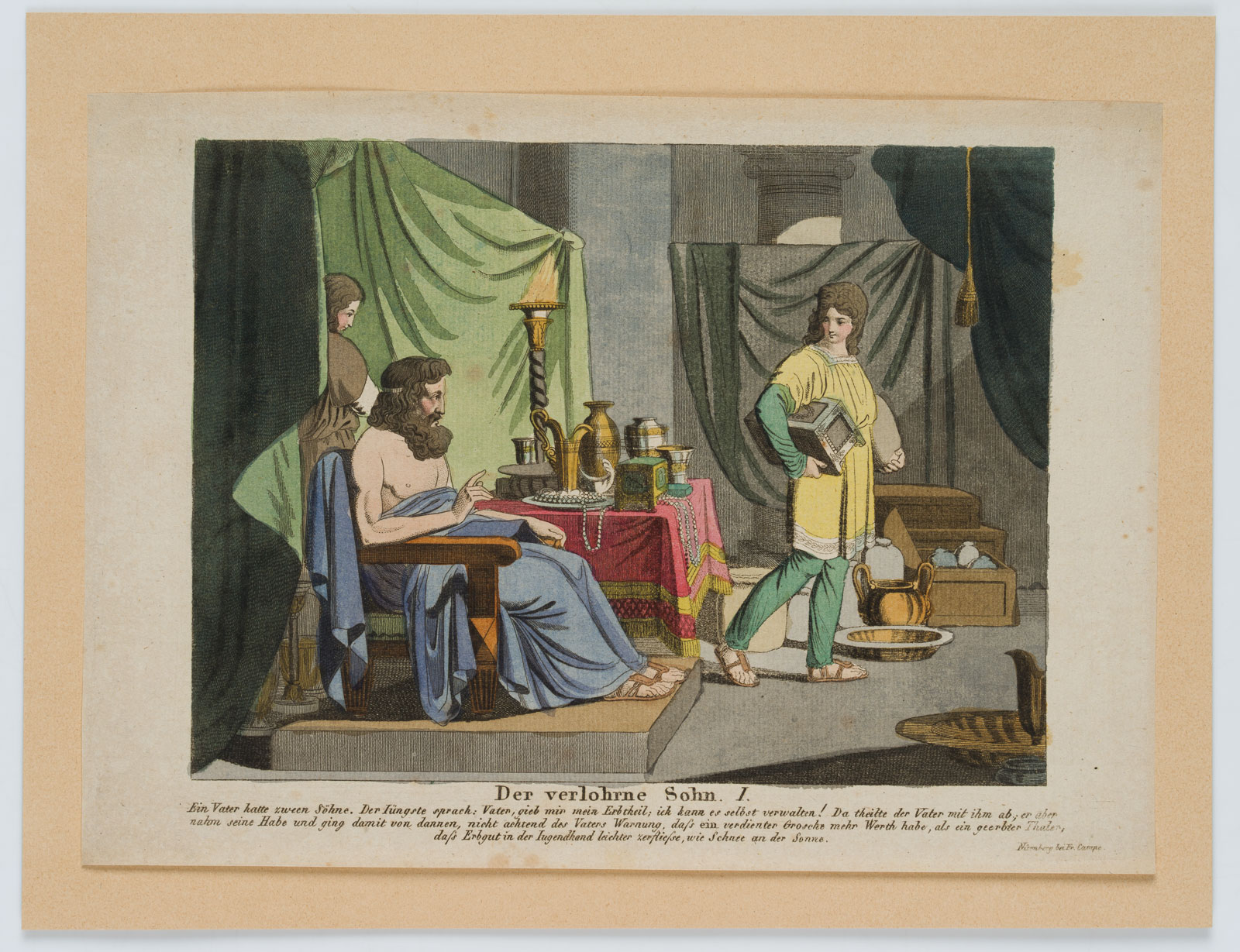 Unbekannt (19. Jahrhundert), Bibelillustration ‘Der verlorene Sohn’, Blatt I., Anfangsszene, in der der Sohn mit seinem geforderten Erbe unterm Arm den Vater verlässt, 19. Jahrhundert, Lithographie