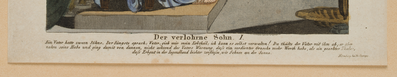 - Bezeichnung: Unterhalb beschriftet und von einem Erzähltext begleitet. Mit Angabe zum Verleger: “Nürnberg bei Fr. Campe”. August Friedrich Campe (1777 Holzminden – 1846 Nürnberg) war Buchhändler und betrieb einen Verlag vornehmlich aufklärerischer Richtung. 1825 setzte er in Leipzig die neue Börsenordnung durch und wurde Mitbegründer erster Vorsteher des Börsenvereins Deutscher Buchhändler.