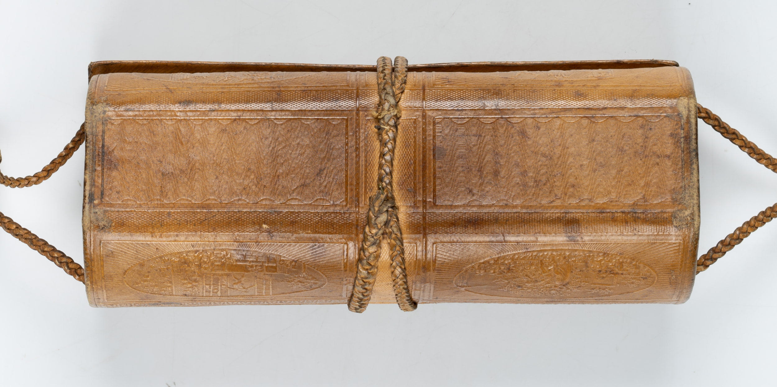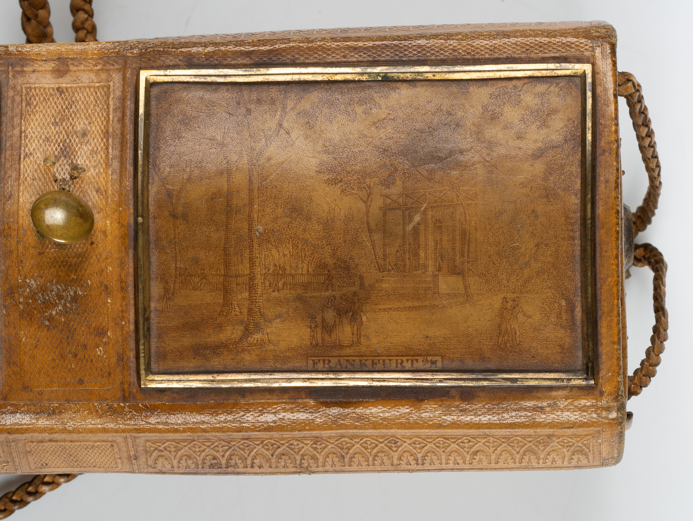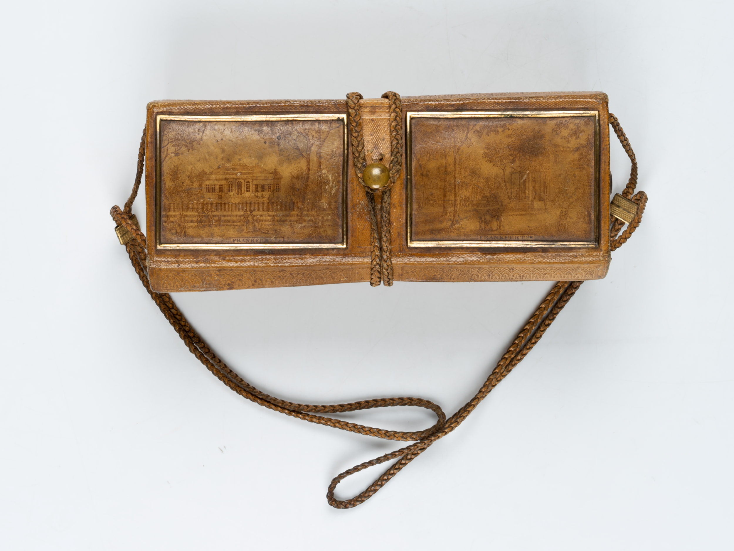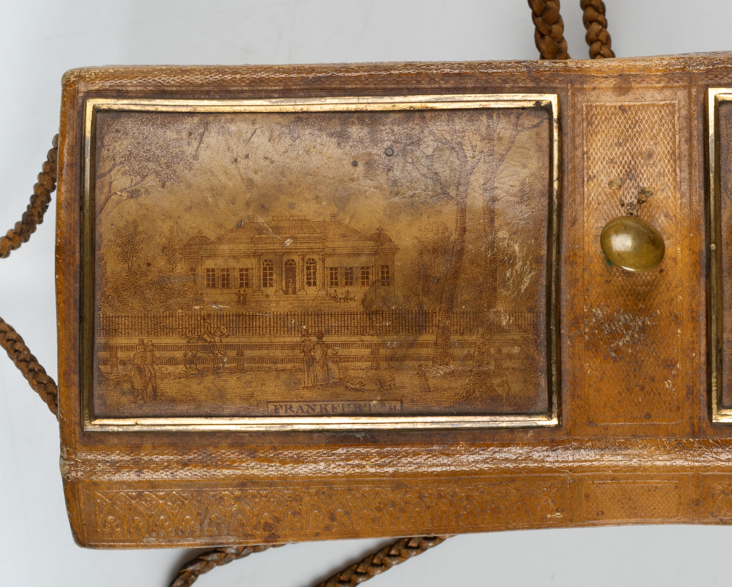 Dieses überaus feine Näh-Etui ist in der Biedermeierzeit um 1820 entstanden. Es ist aus Leder mit geflochtenen Lederbändern zum Verschließen und Befestigen. Das Leder ist mit Ornamentik und schönen Darstellungen geprägt. Diese zeigen unter anderem die Ansicht einer klassizistischen Häuserfassade. Sie ist mit “Frankfurt a./M.” bezeichnet. Innen ist das Kästchen mit grünem Papier ausgekleidet.