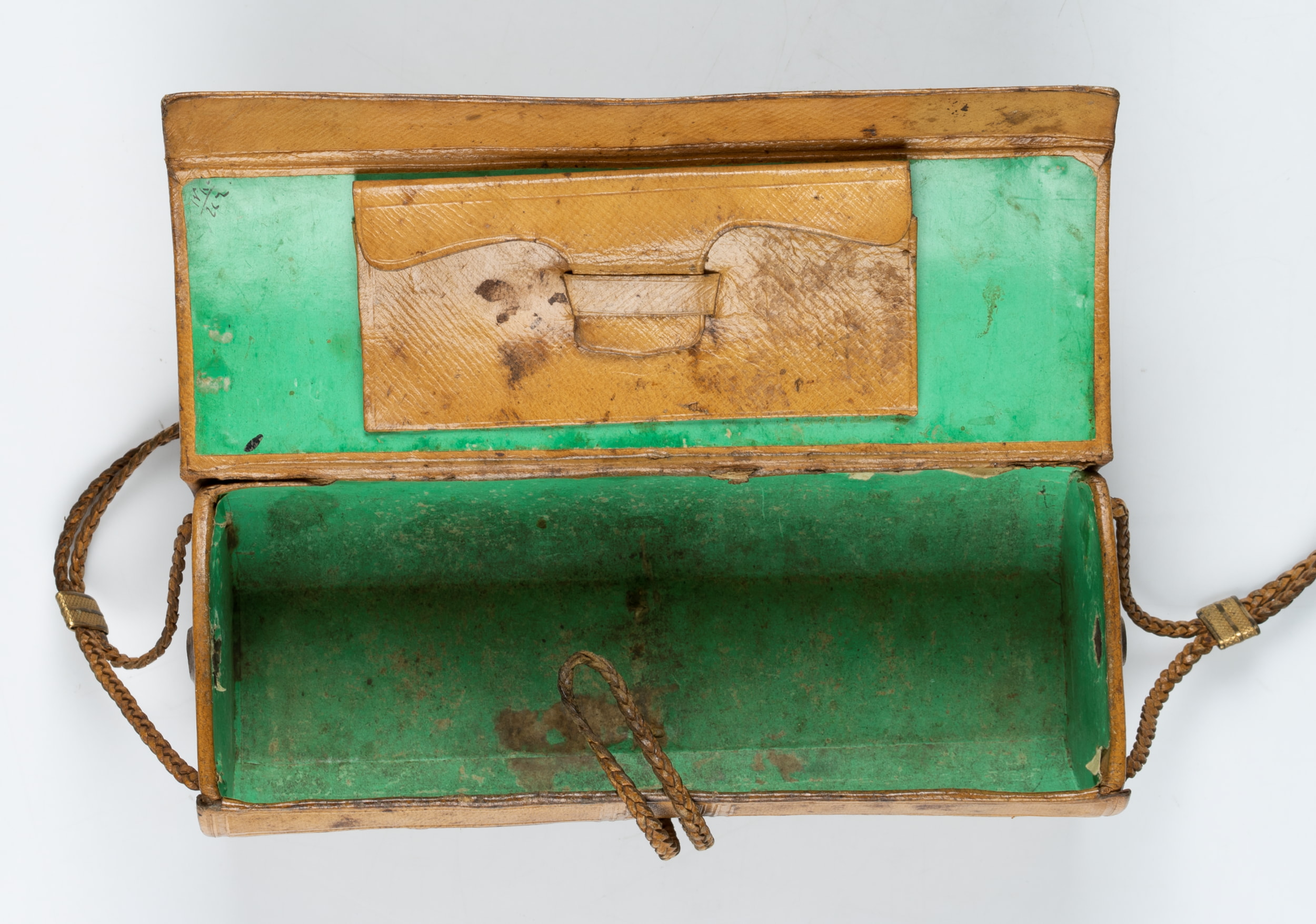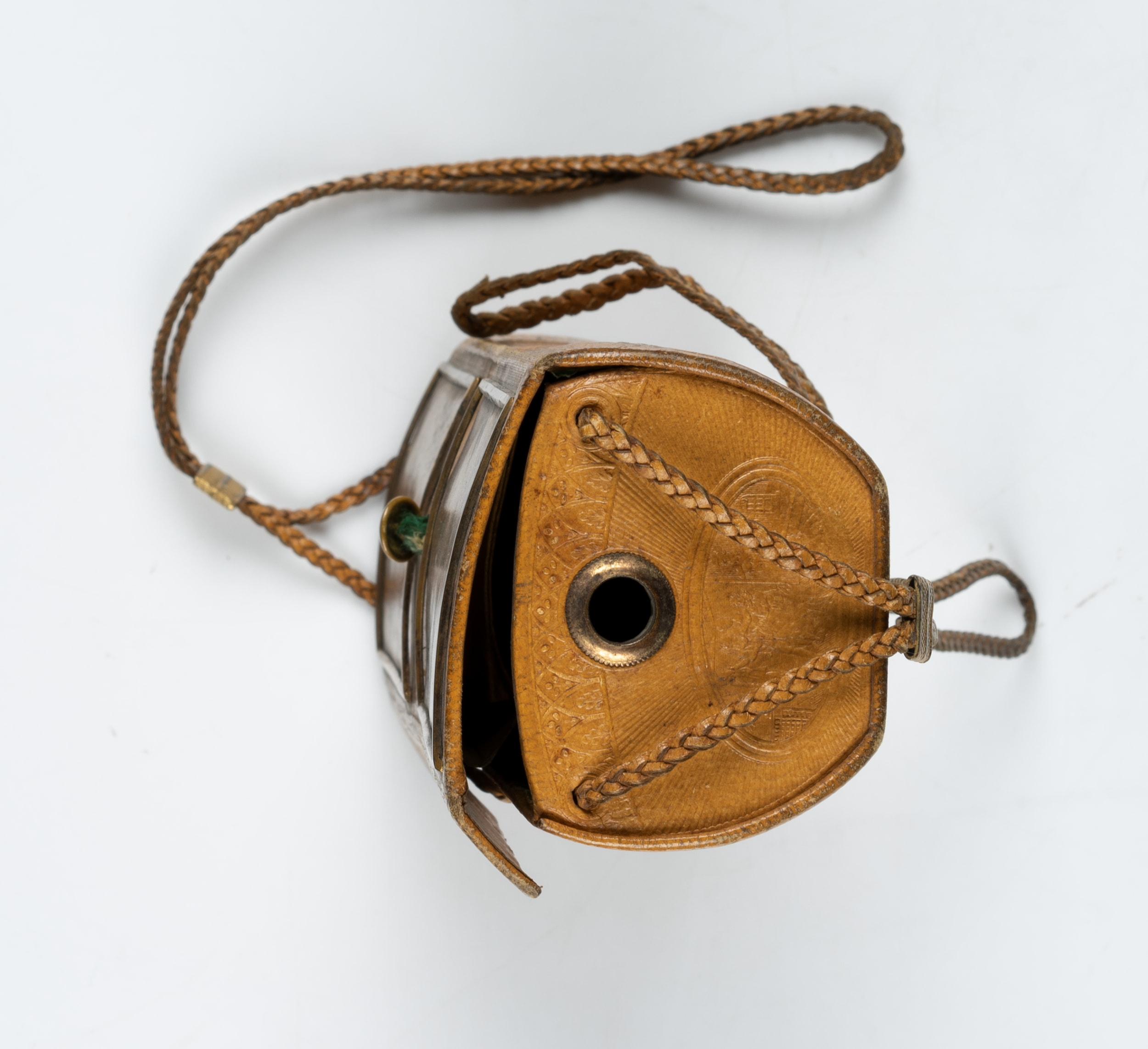 • Beschreibung: Dieses überaus feine Näh-Etui ist in der Biedermeierzeit um 1820 entstanden. Es ist aus Leder mit geflochtenen Lederbändern zum Verschließen und Befestigen. Das Leder ist mit Ornamentik und schönen Darstellungen geprägt. Diese zeigen unter anderem die Ansicht einer klassizistischen Häuserfassade. Sie ist mit “Frankfurt a./M.” bezeichnet. Innen ist das Kästchen mit grünem Papier ausgekleidet.