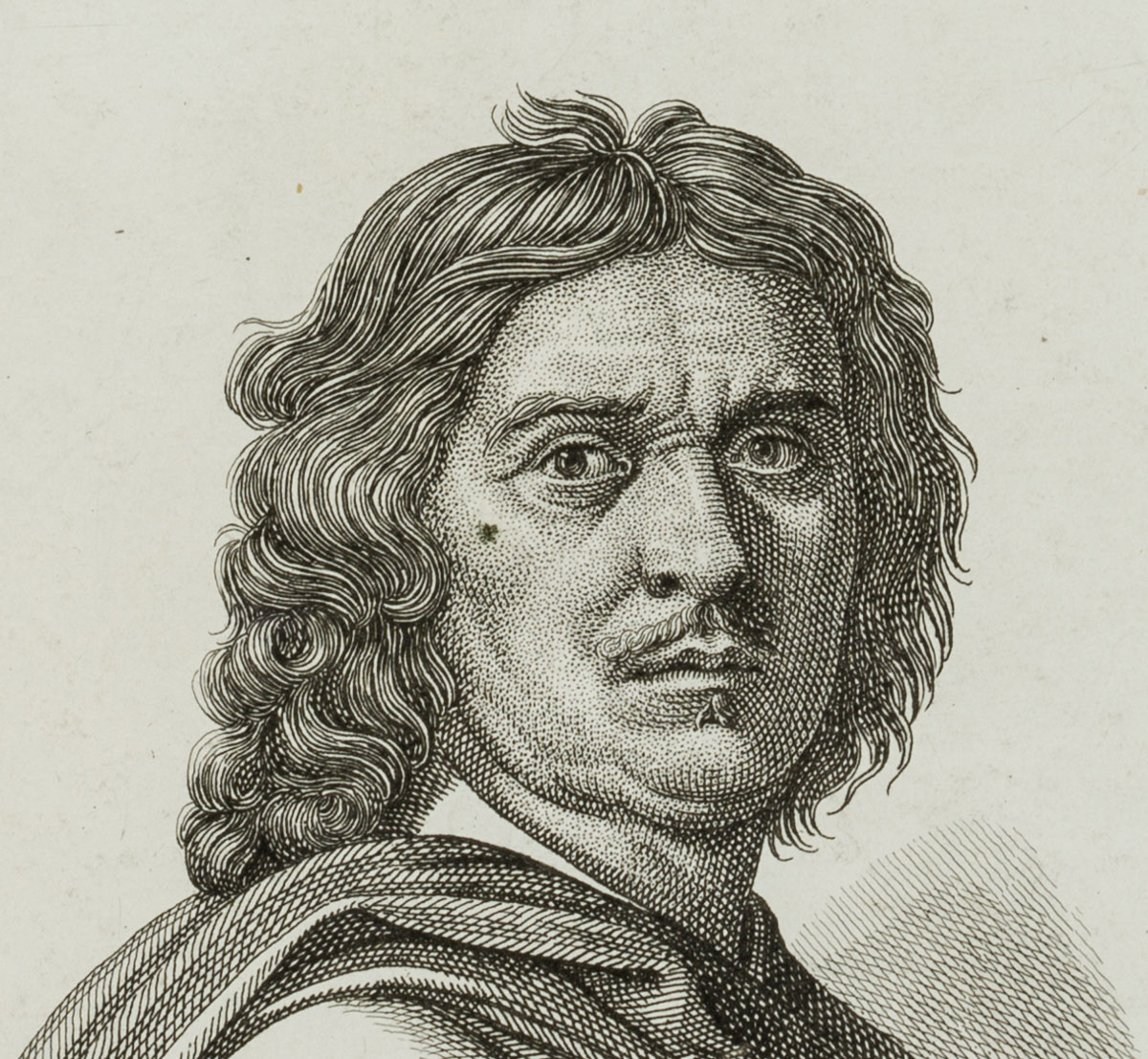 - Beschreibung: ohne Bezeichnung. Im Brustbild begegnet den Betrachtenden der französische Maler Nicolas Poussin und blickt diesen aufmerksam entgegen. Die Darstellung geht vermütlich auf ein Selbstbildnis des Barockmalers von 1694-50 zurück, in welchem er sich selbstbewusst inszeniert. Poussins Werke zählen noch immer zu den herausragendsten Zeugnissen seiner Zeit.
