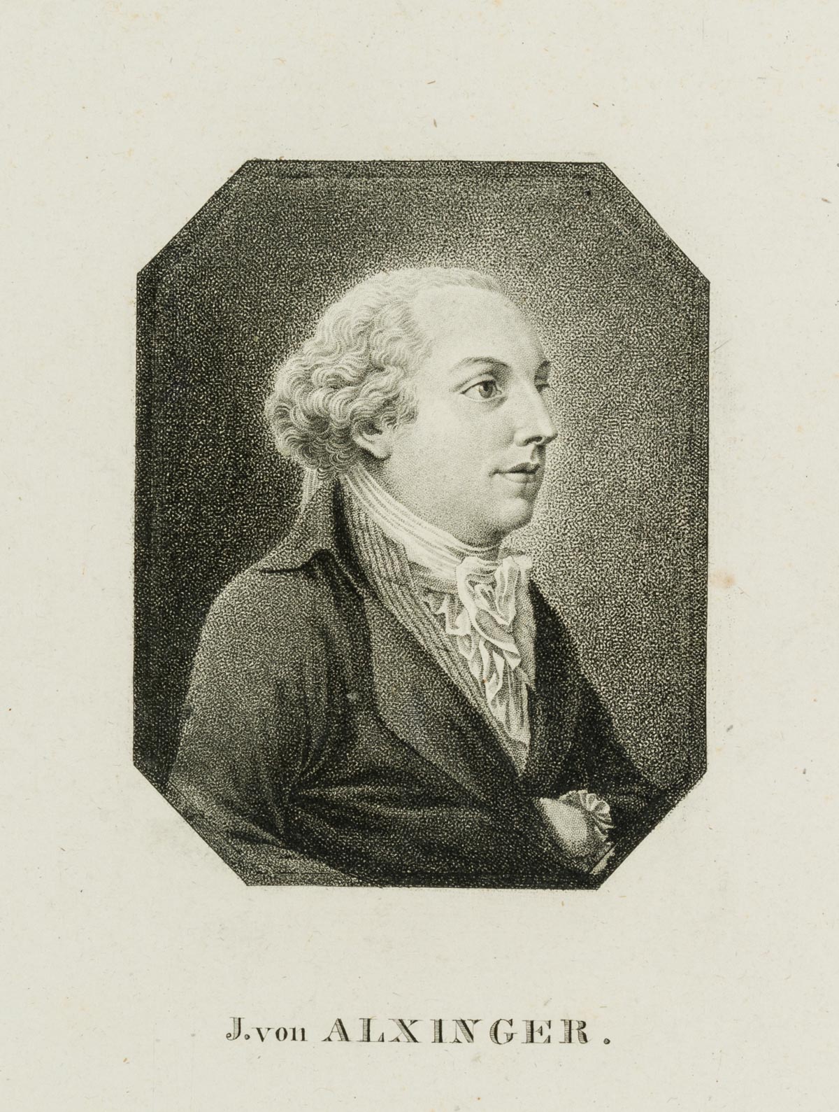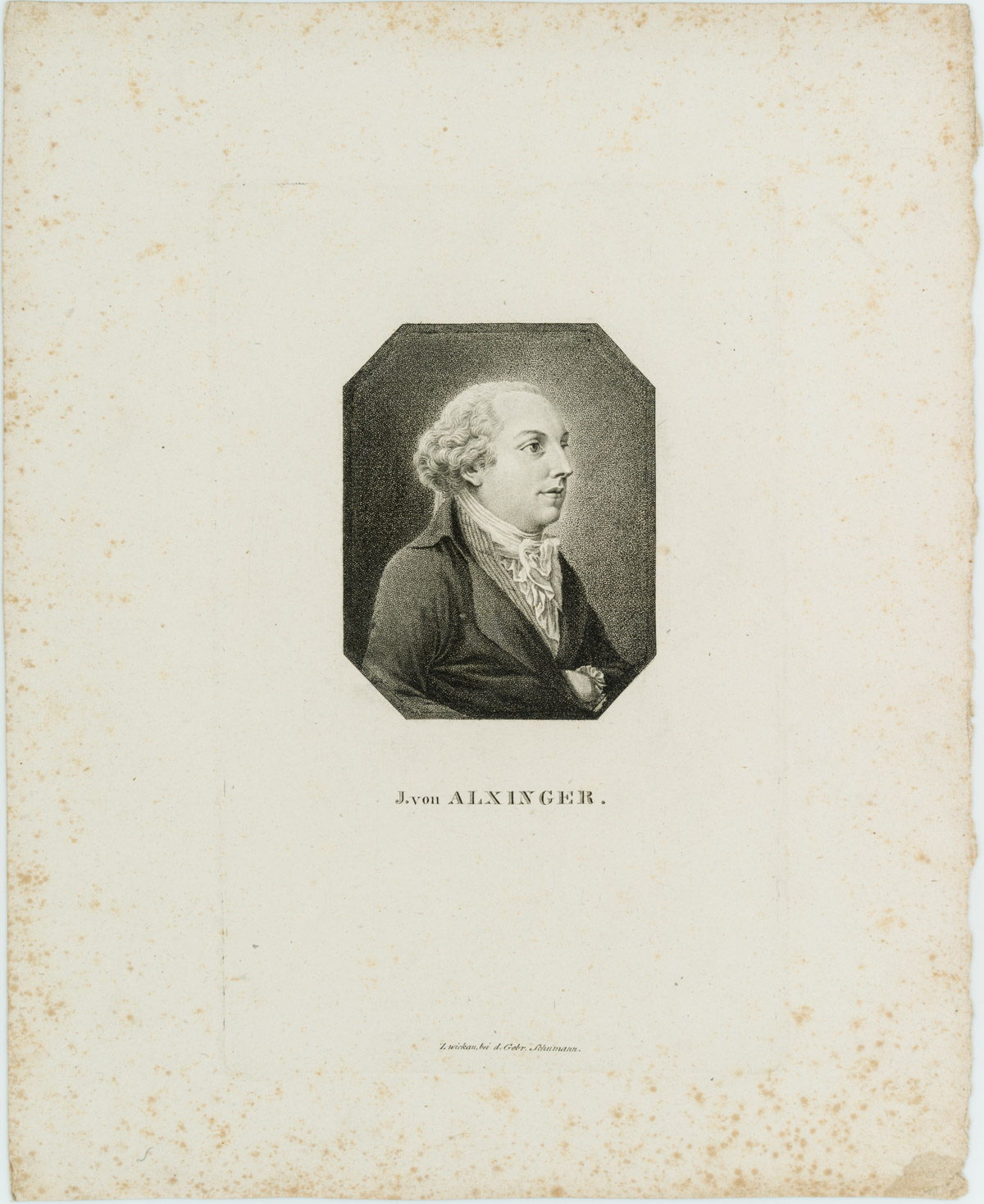 - Beschreibung: ohne Bezeichnung, erschienen bei den Gebrüdern Schumann, Zwickau. Im Brustbild ist der österreichische Schriftsteller Johann Baptist von Alxinger zu sehen. In seinen Epen und Gedichten artikulierte er die Ideale der Aufklärung.