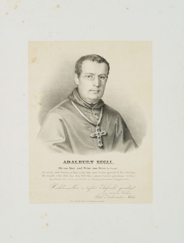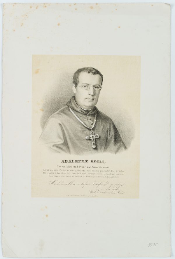 - Inscription: Inscribed below the image in the printing plate with the name of the sitter as well as “Abbot of Muri and Prior of Gries (in Tyrol)..Dedicated to the same in deepest reverence by his admirer / Paul v. Deschwander, painter / Lith. u. Kunsth. v. Gebr. C. u. N. Benziger in Einsiedeln”. Numbered in the lower right corner of the sheet: “9725”.