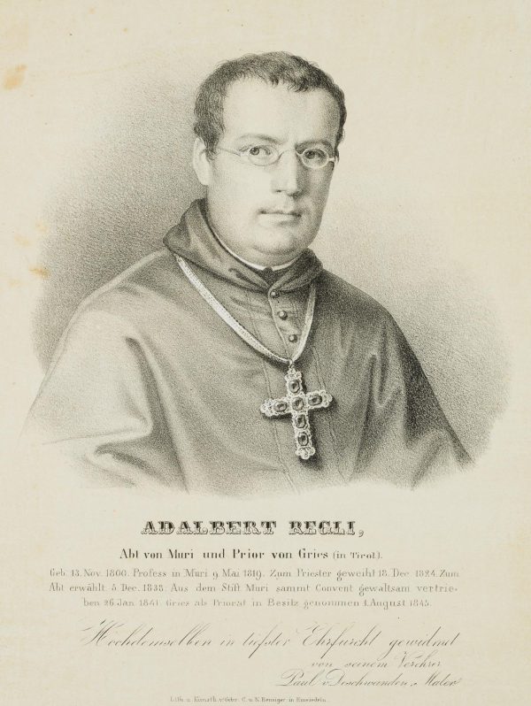 Schöne Porträtdarstellung des Schweizer Benediktinermönchs Adalbert Regli (1880 Prato – 1881 Gries-Quirein). Von 1838 bis 1841 war er Abt des Klosters Muri im Kanton Aargau - Datierung: 1845