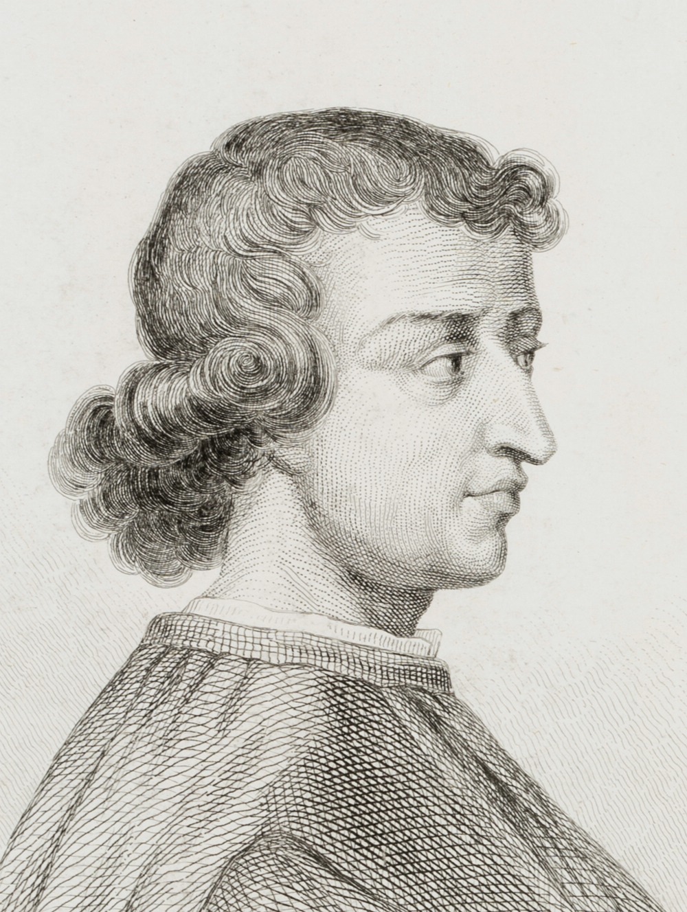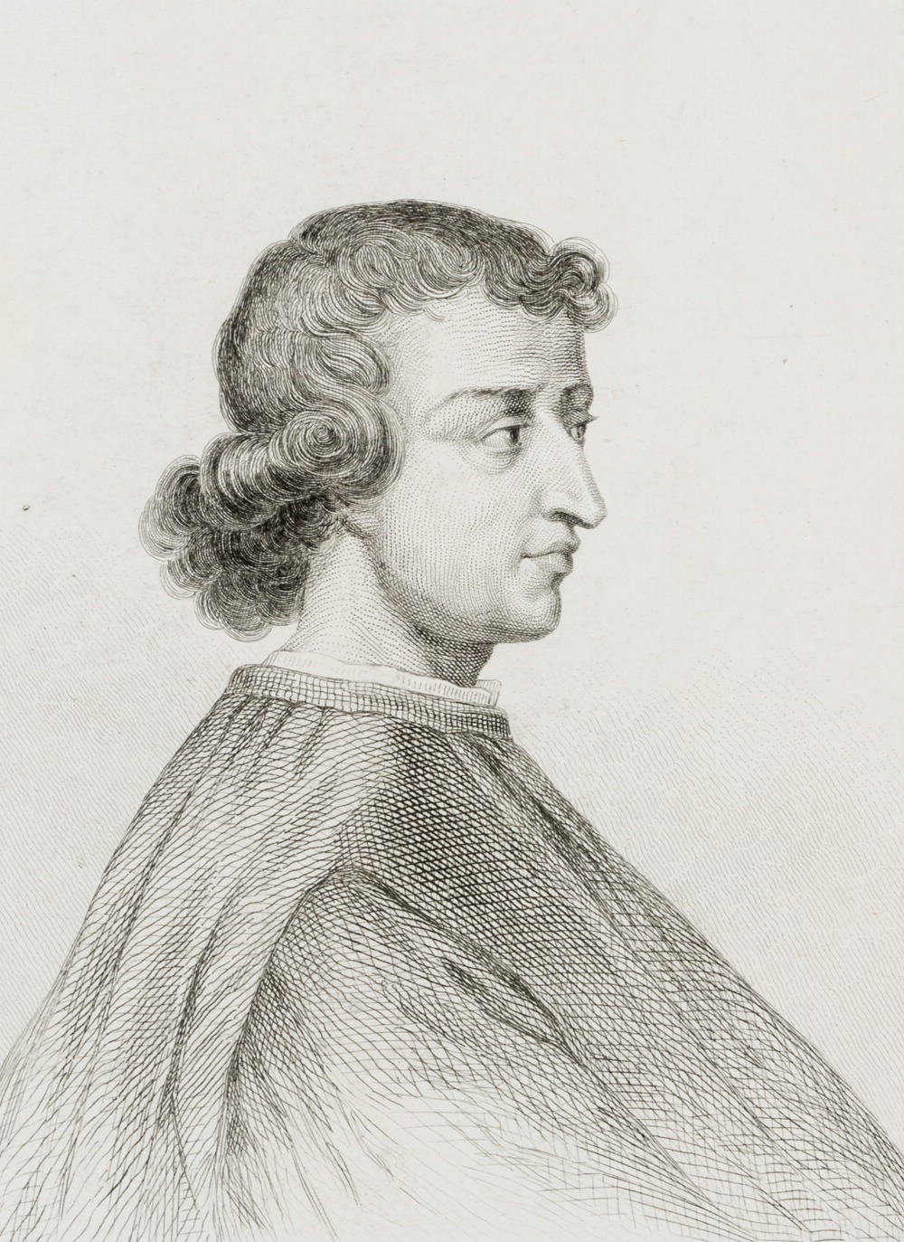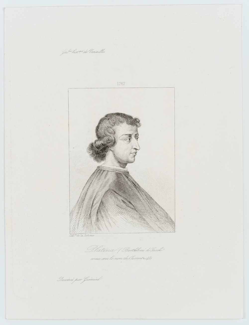 Brustbild des ital. Humanisten Bartolomeo Platina (1421-1481) im Dreiviertelprofil. In der Druckplatte in französischer Sprache bezeichnet. Gedruckt für die “Coll.on de la Sorbonne”.