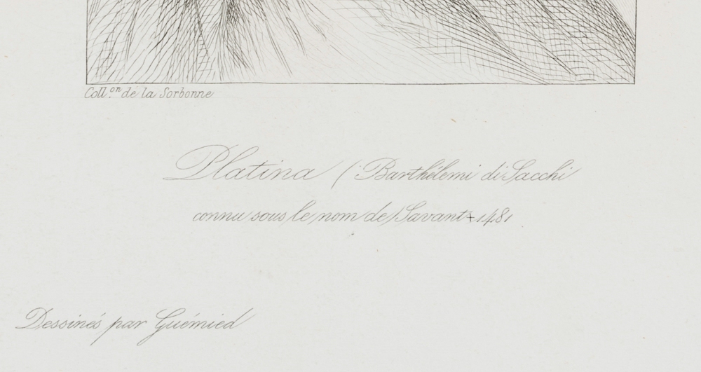 • Description: Half-length portrait of the Ital. Humanist Bartolomeo Platina (1421-1481) in three-quarter profile. Inscribed in French on the printing plate. Printed for the “Coll.on de la Sorbonne”.