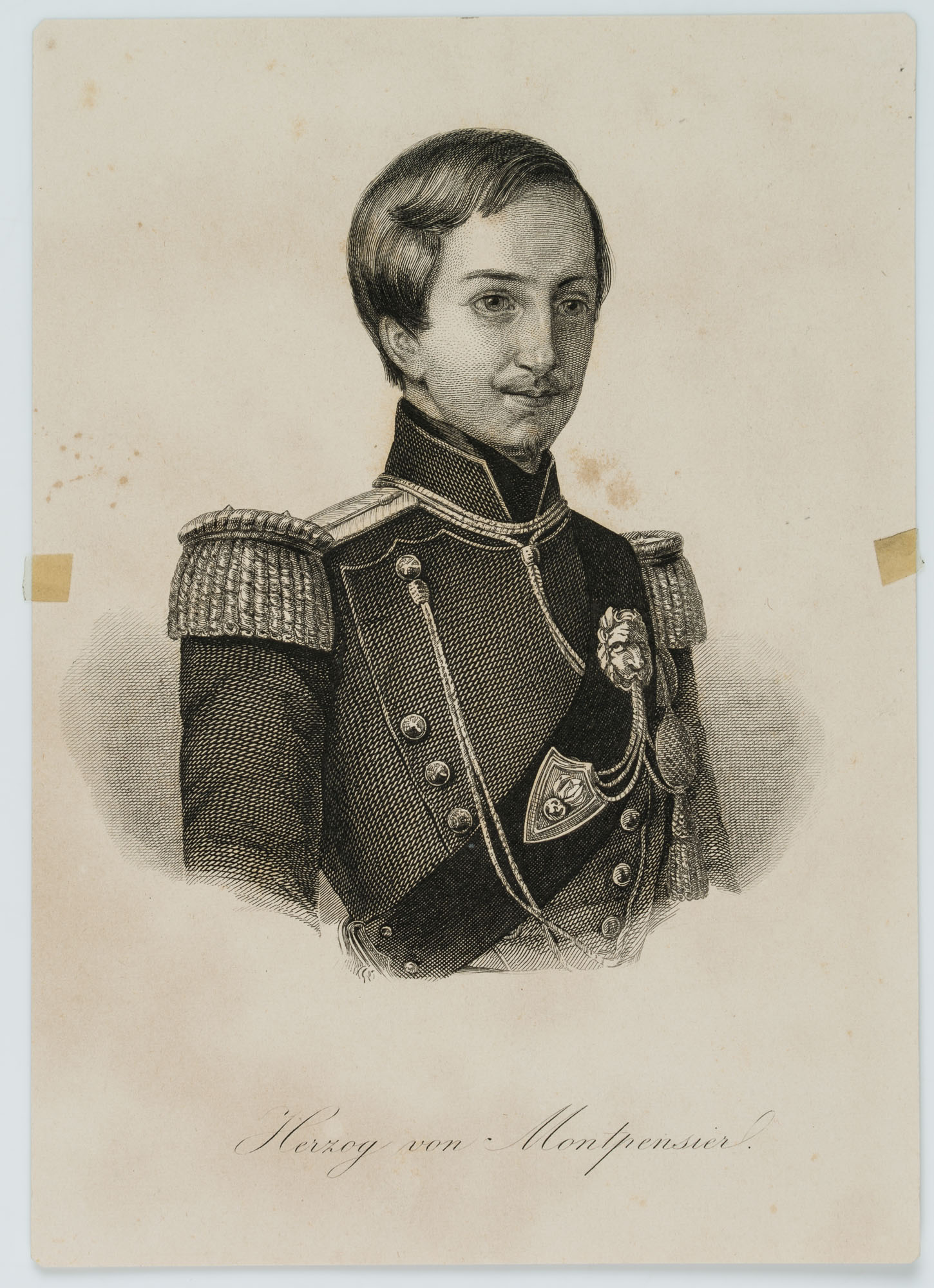 This steel engraving shows the French officer Antoine d’Orléans (1824 Neuilly-sur-Seine – 1890 Sanlúcar de Barrameda), duc de Montpensier. He was considered a promising candidate during the Spanish succession 1868-1870. - Date: 19th century