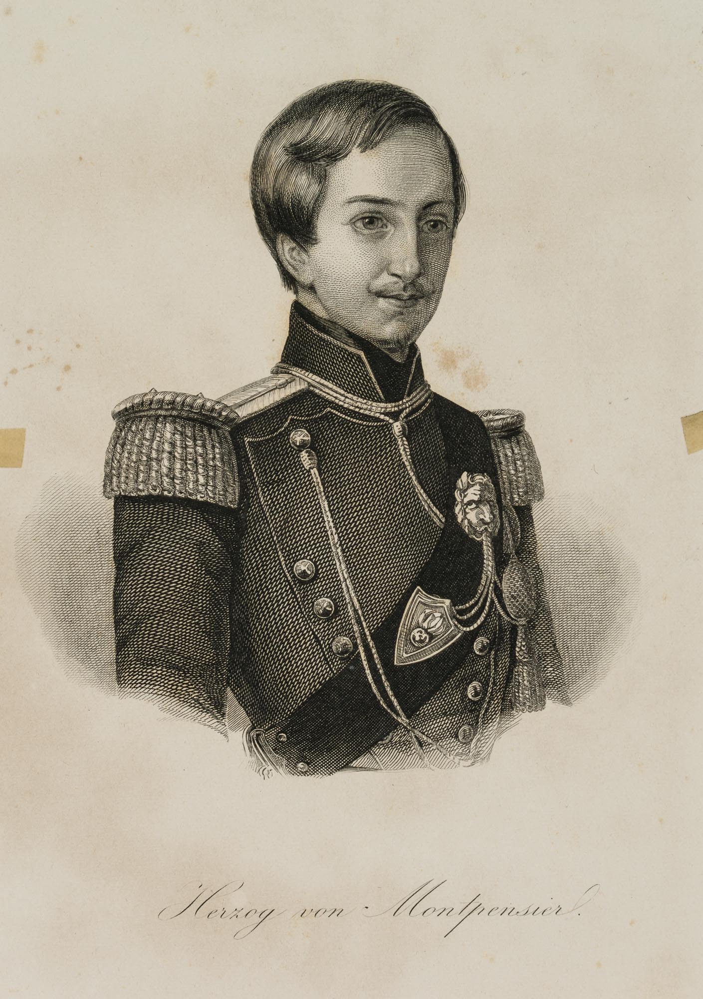 Der vorliegende Stahlstich zeigt den französischen Offizier Antoine d’Orléans (1824 Neuilly-sur-Seine – 1890 Sanlúcar de Barrameda), duc de Montpensier. Er galt als aussichtsreicher Kandidat während der Spanischen Thronfolge 1868-1870. - Datierung: 19. Jahrhundert
