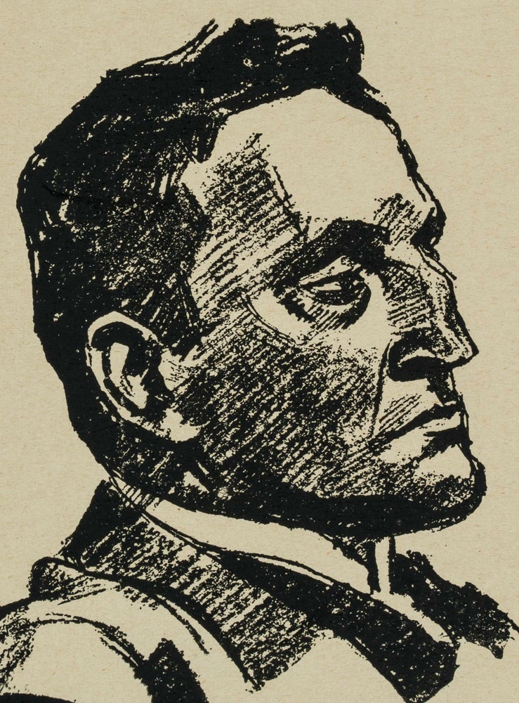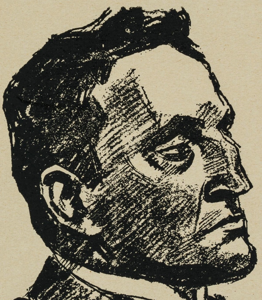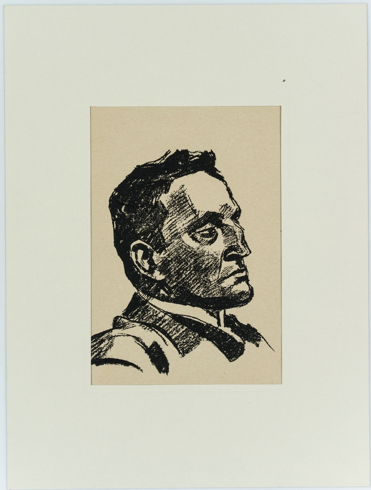 - Description: no designation The portrait of an unknown man with a serious look and striking facial features is shown in profile facing away from the subject. His shoulders are schematically indicated and parts of his clothing are visible.