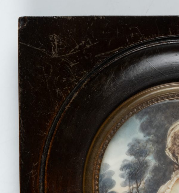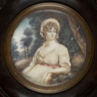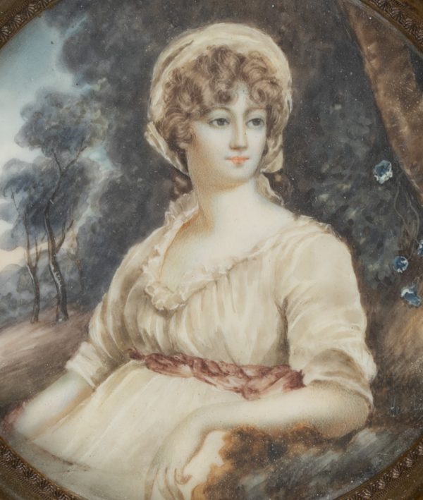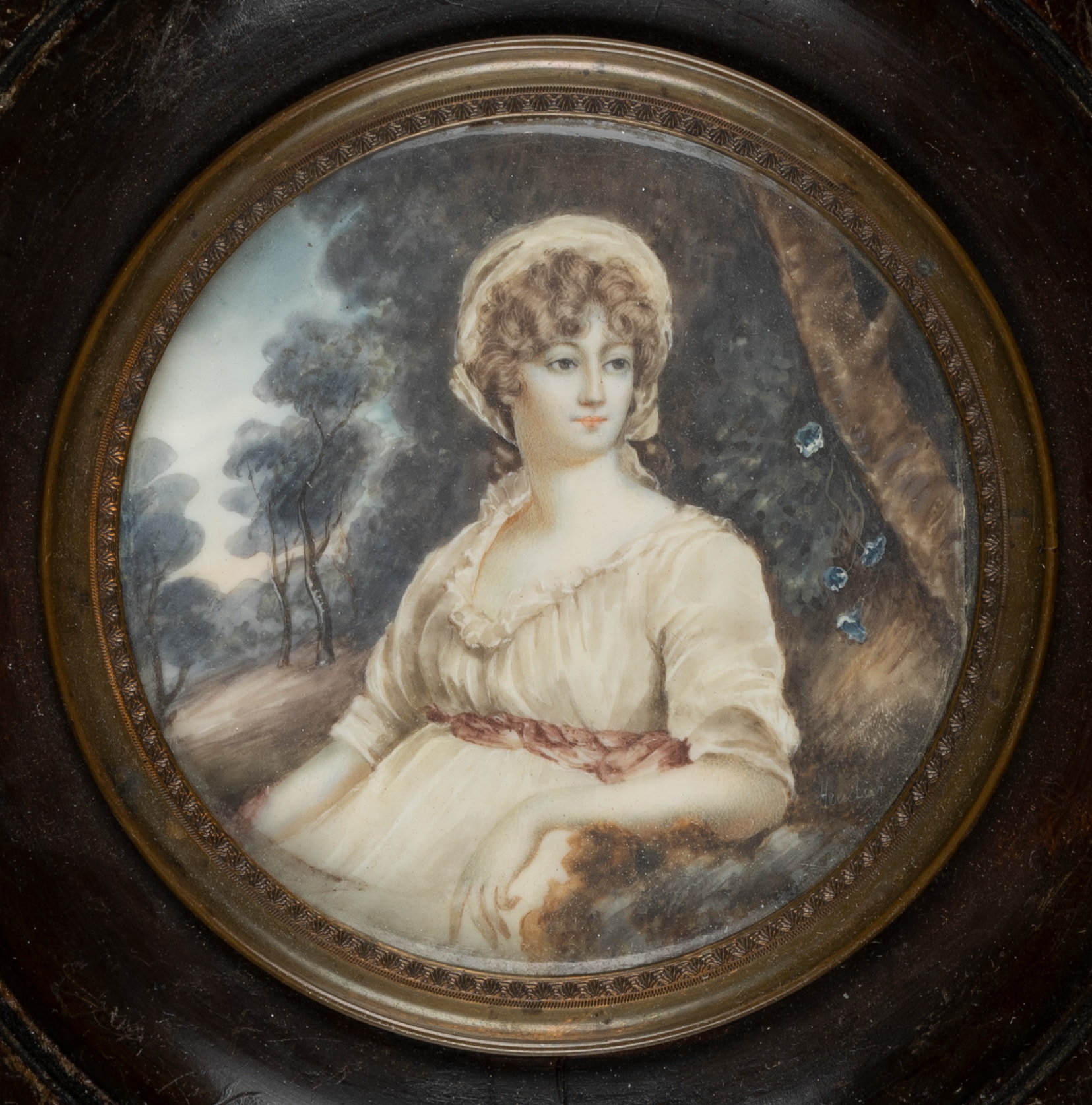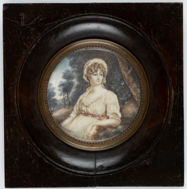- Beschreibung: Das runde Porträt zeigt eine junge Frau in klassizistischer Kleidung mit einer schlichten Kopfbedeckung. Im Hintergrund sind die Bäume eines Parks zu sehen.