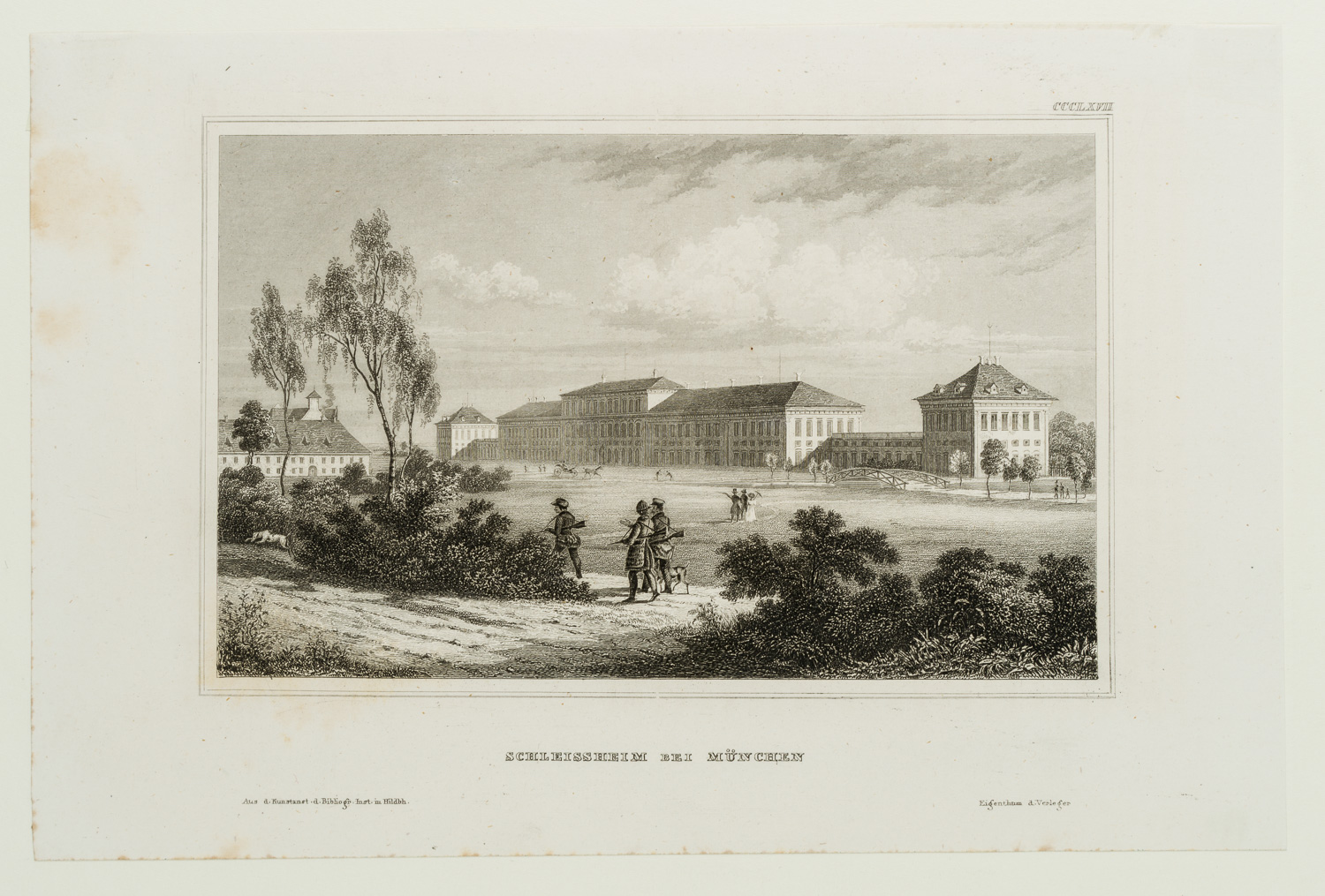 - Inscription: Titled “SCHLEISSHEIM BEI MÜNCHEN” below the image. The sheet bears the number “CCCLXVII” at upper right. Subsequently dated in pencil on the reverse “1865”.