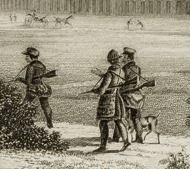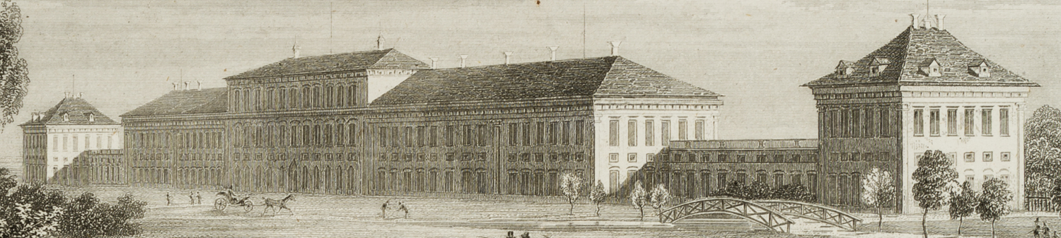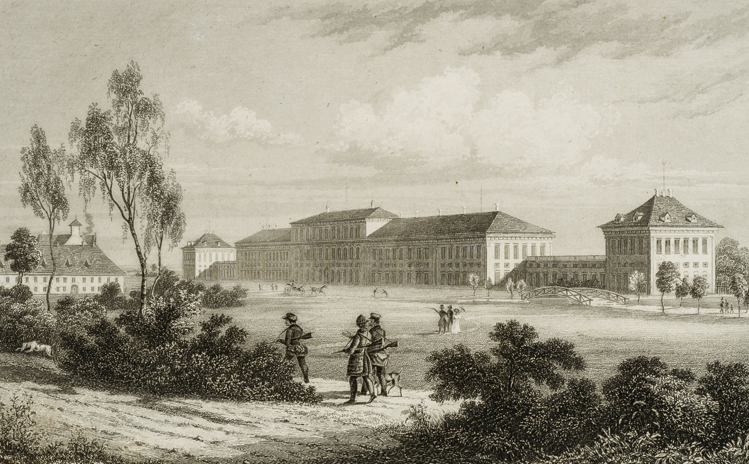Unknown (19th century), Further view of the baroque Schleißheim palace complex with strolling hunters in the foreground, 1865, Steel engraving