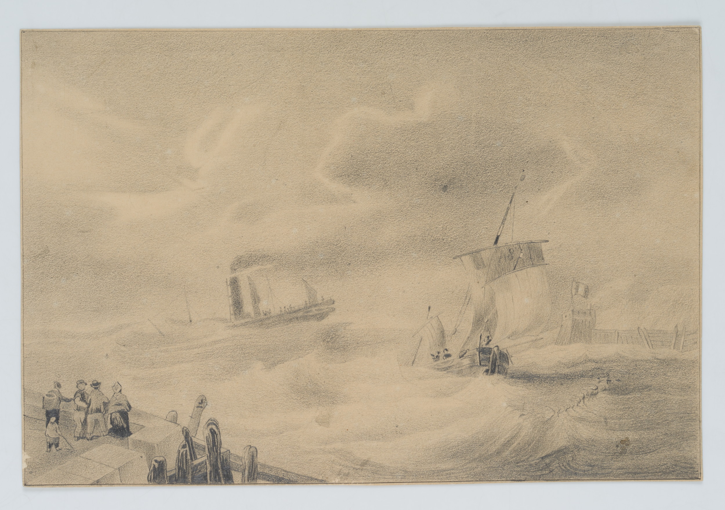 Unknown (19th century), View of a stormy sea from the harbour, c. 1840, Pencil