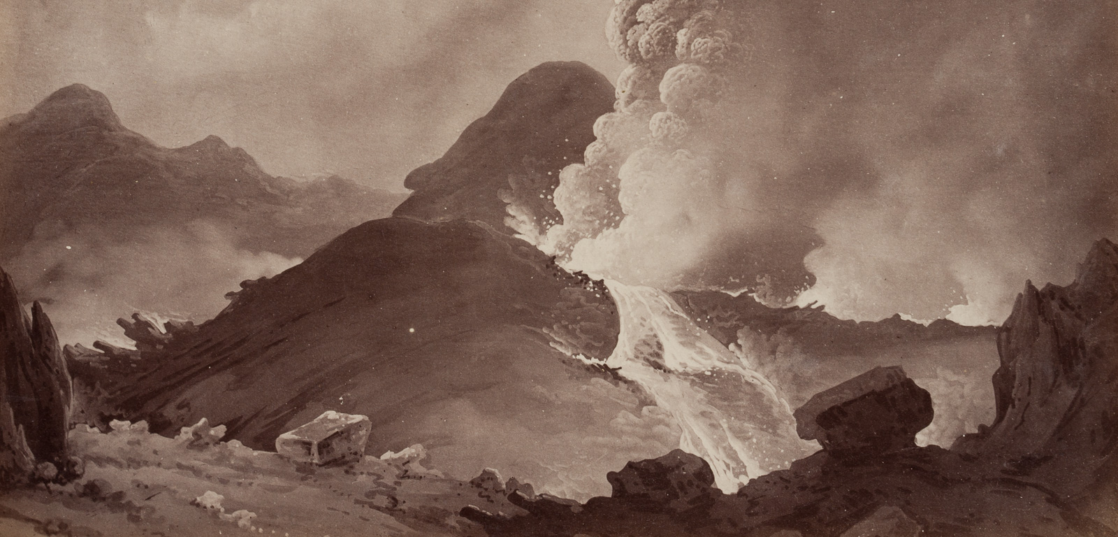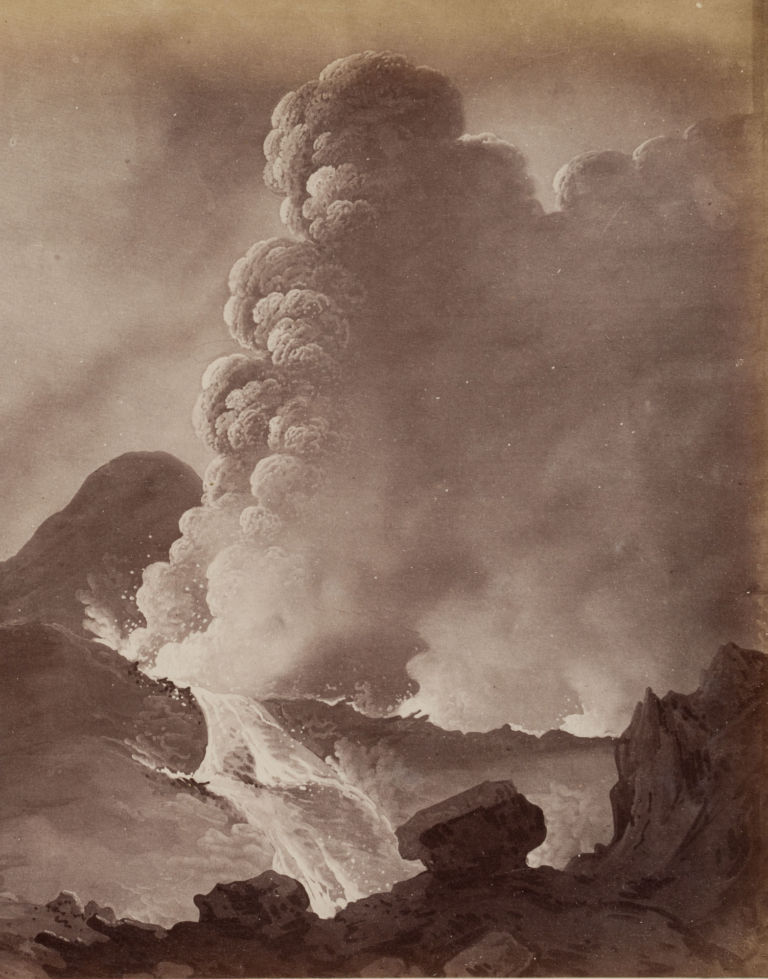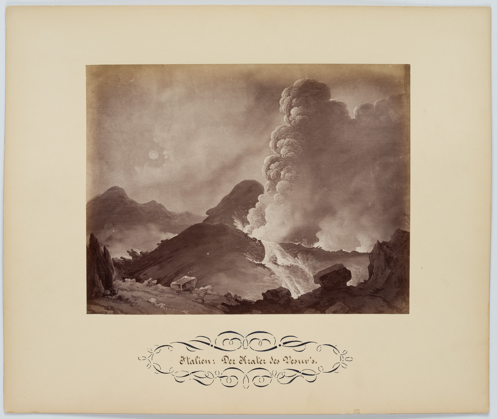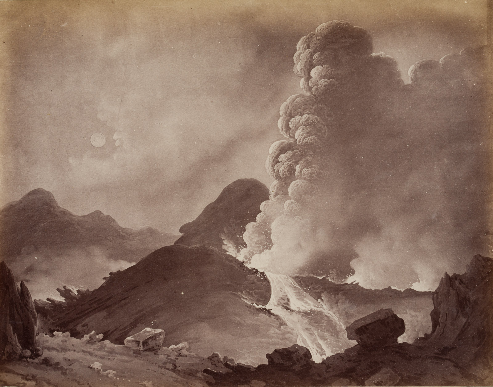 Unknown (19th century), View into the erupting crater of Vesuvius, scene of a powerful natural spectacle, Italy, photograph of a painting, c. 1880, Sepia-Photography