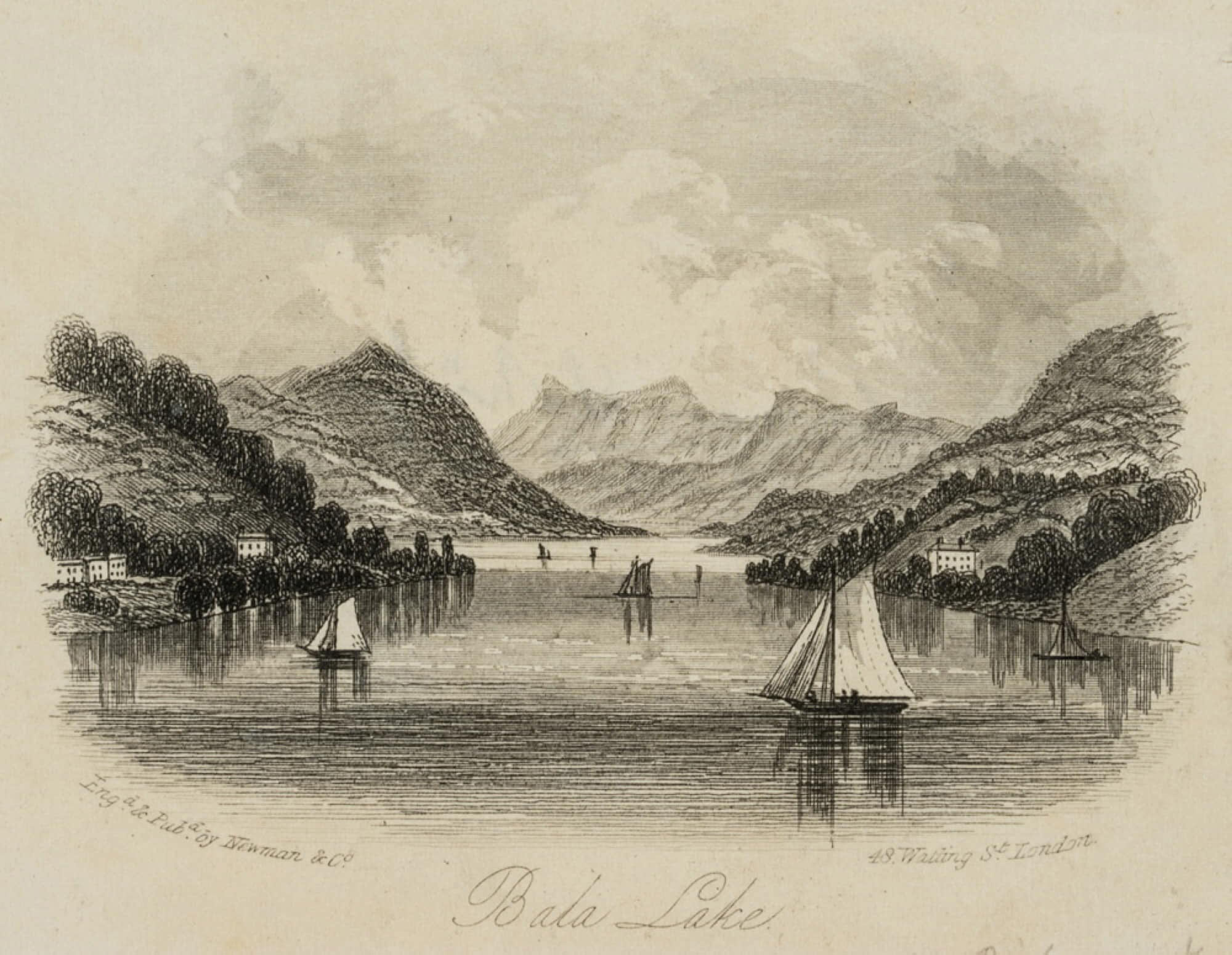 Unbekannt (19. Jahrhundert), Blick über Bala Lake (Llyn Tegid) in Nordwales, Andenken eines Reisenden, 1855, Stahlstich