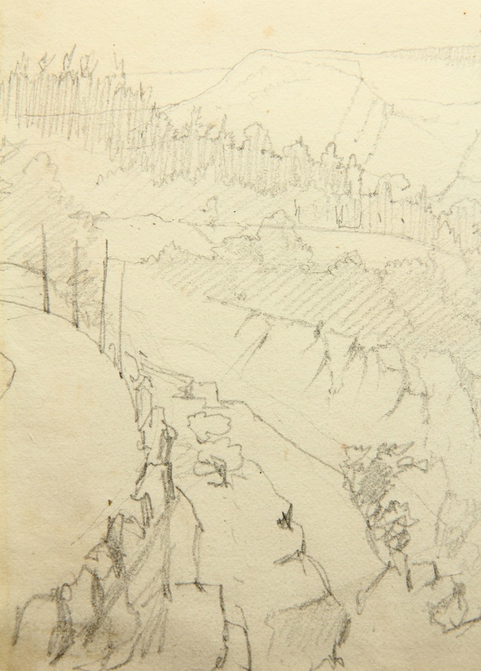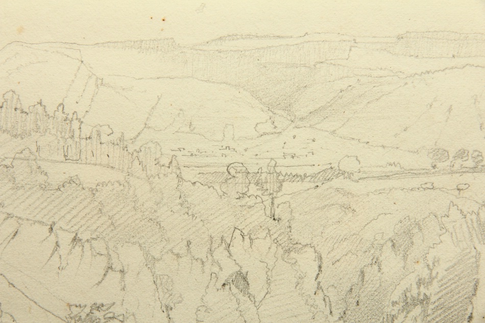 - Description: Beautiful landscape painting in the sketchbook of an unknown artist. From a densely wooded hill the artist looks over the valley of the Alb and the nearby hills of the Black Forest.