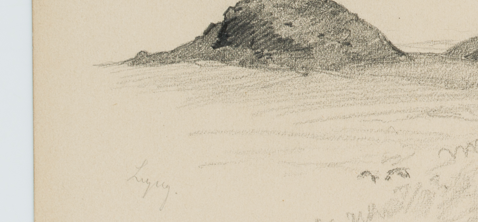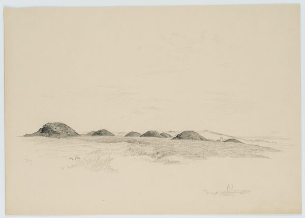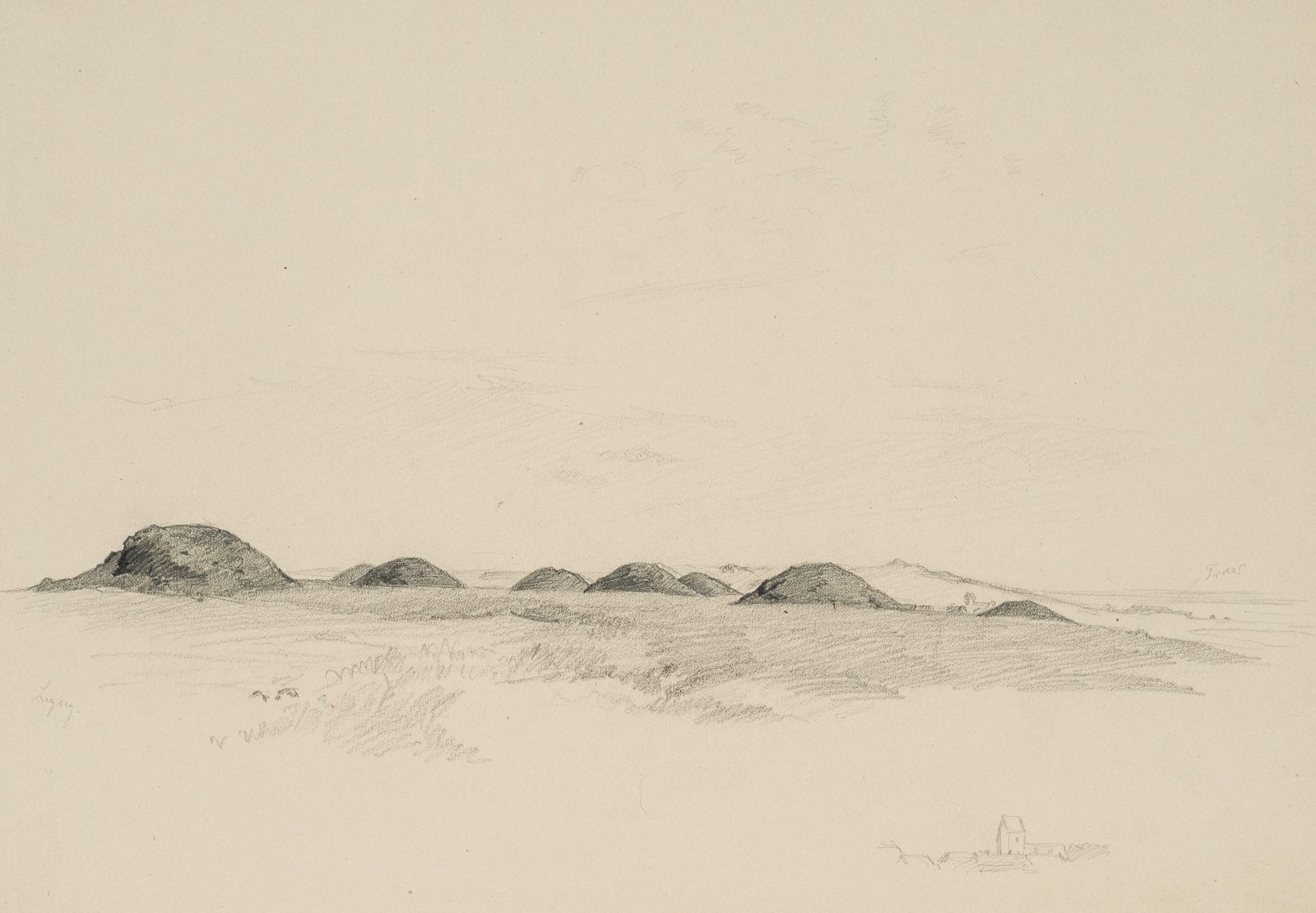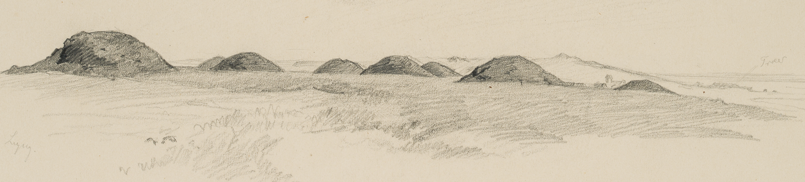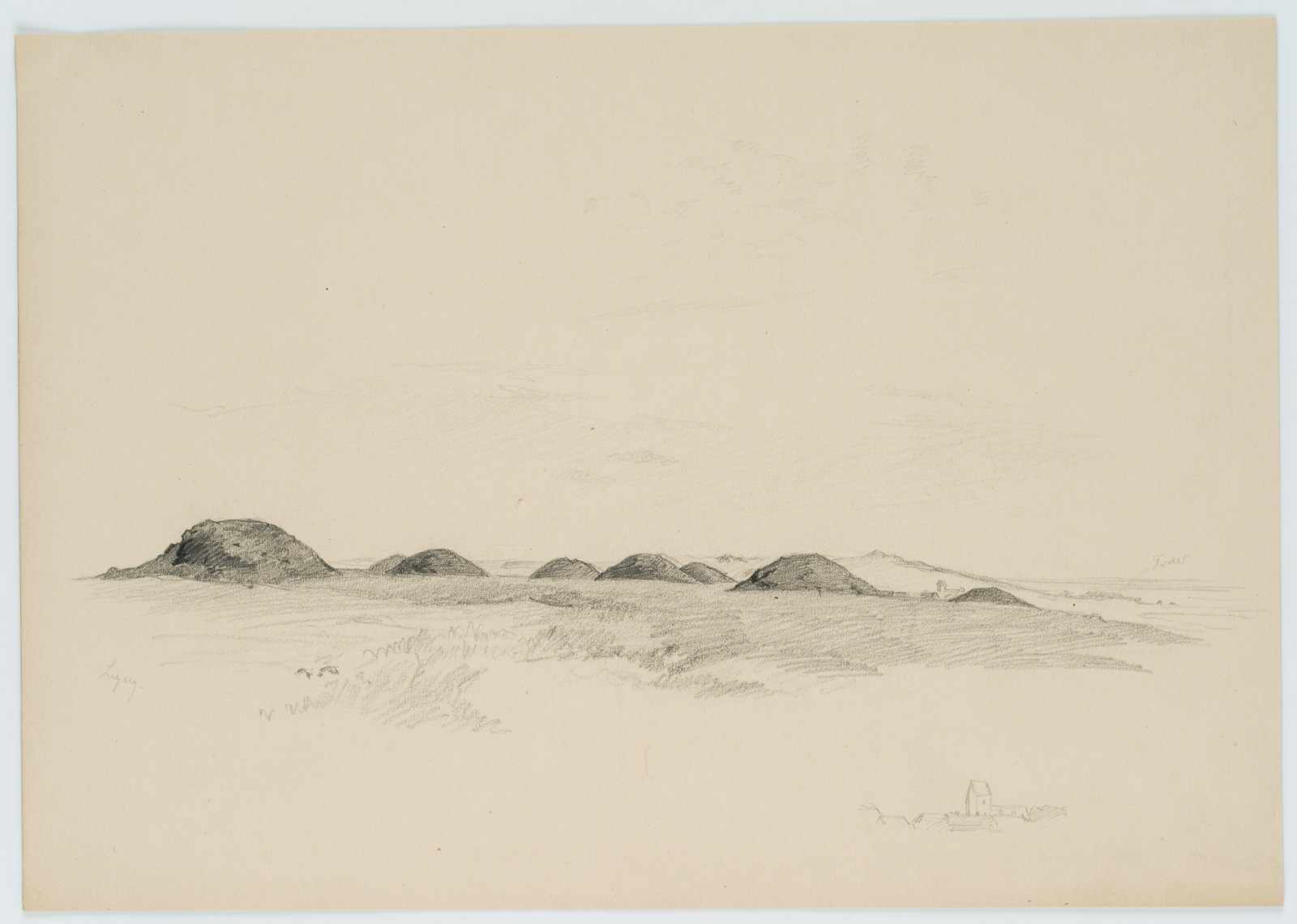 - Description: Dark, low mounds of earth are scattered across the wide, vegetationless field. In the distance, the viewer sees the silhouette of a housing estate. The sky, which takes up two-thirds of the picture, is indicated in a reduced form. Another place in the distance is labelled with the name “Treer[?]”.
