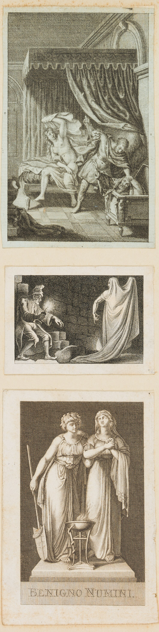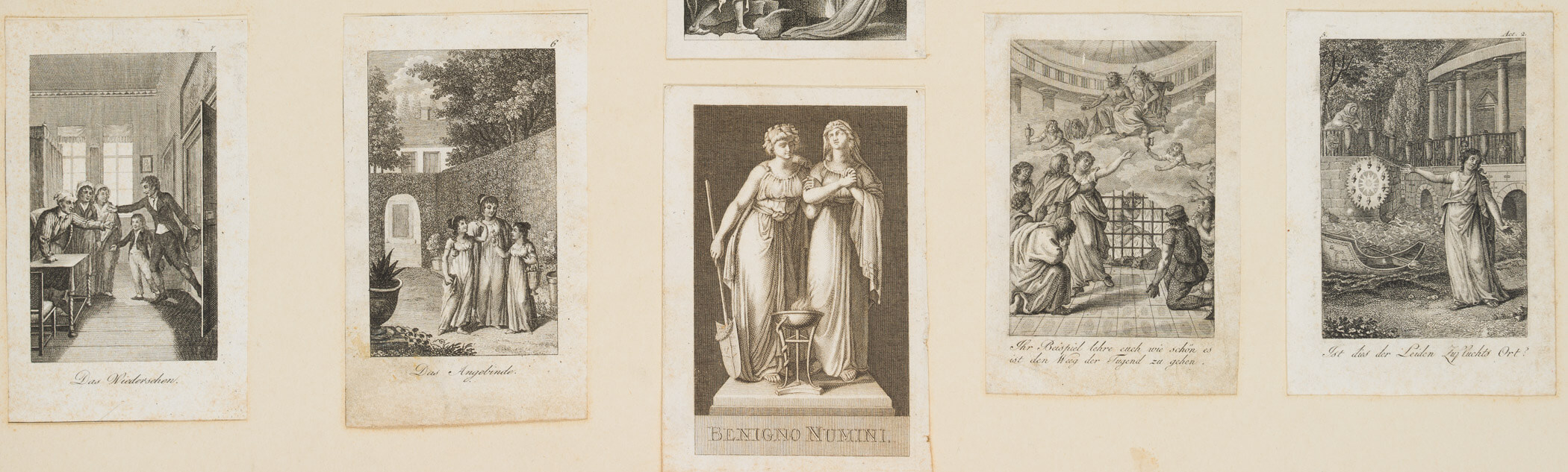 - Description: Title copperplate and literary illustrations. These include a scene of a burial, a joyful reunion, a mother with her daughters in the garden, a ghostly meeting in a cellar dungeon, etc.
