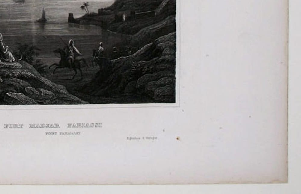 Stahlstich eines unbekannten Künstlers, bezeichnet unten: “Im Bosporus beim Fort Madjar Fabiassi Fort Rumeli Kawak Fort Fanaraki Aus d. Kunstanst. d. Bibl. Inst. in Hildbh. Eigenthum d. Verleger”, nummerie rt oben rechts: ” DCCXXII”. Sehr schöne Ansicht von leicht erhöhtem Standpunkt auf den Bosporus. Rechts im Bild liegt das Fort Madjar Fabiassi auf einem Hügel, am jenseitigen Ufer sind das Fort Fanaraki und Rumeli Kawak sichtbar. Imposante Segelschiffe treiben auf dem ruhigen Wasser, Staffagefiguren beleben den Vordergrund des akademisch komponierten Blattes.