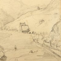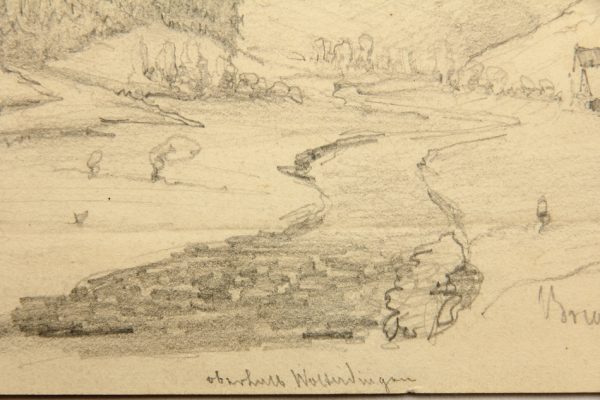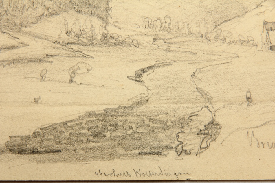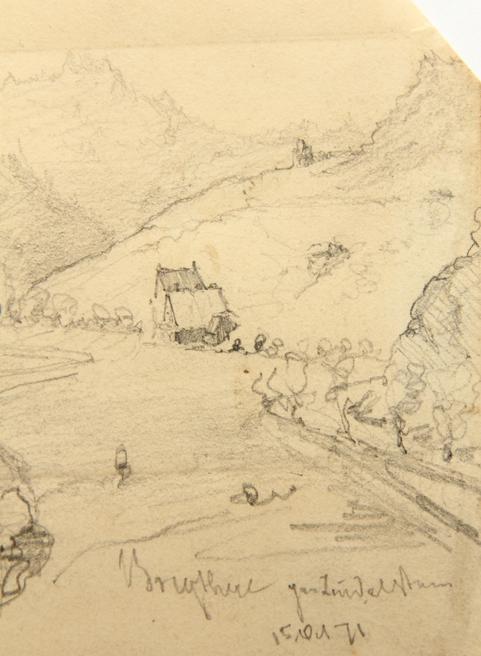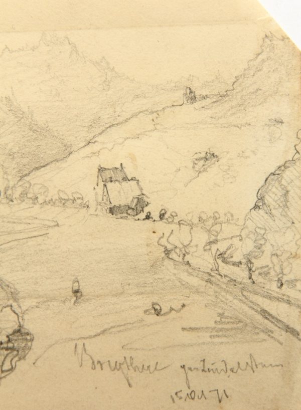 The sheet comes from an anonymous scrapbook containing in particular pencil drawings of architecture and landscape in Germany, especially in the Black Forest and on the Upper Rhine, as well as in Italy, most of which date to the early second half of the 19th century. The unknown artist also shows a certain affinity for railway romanticism and engineering constructions, so that the draughtsman’s professional activity is perhaps to be sought in this environment.