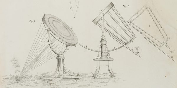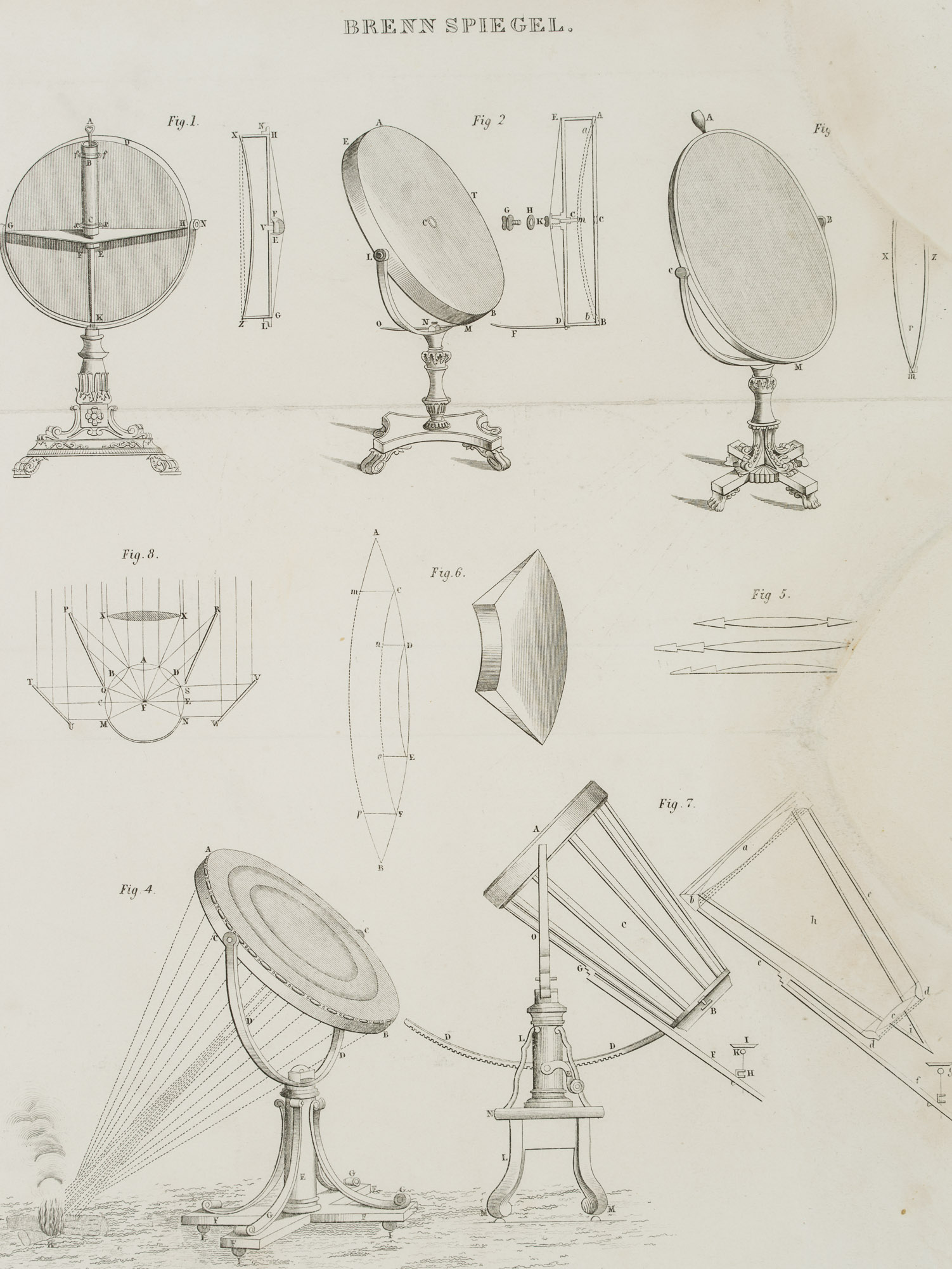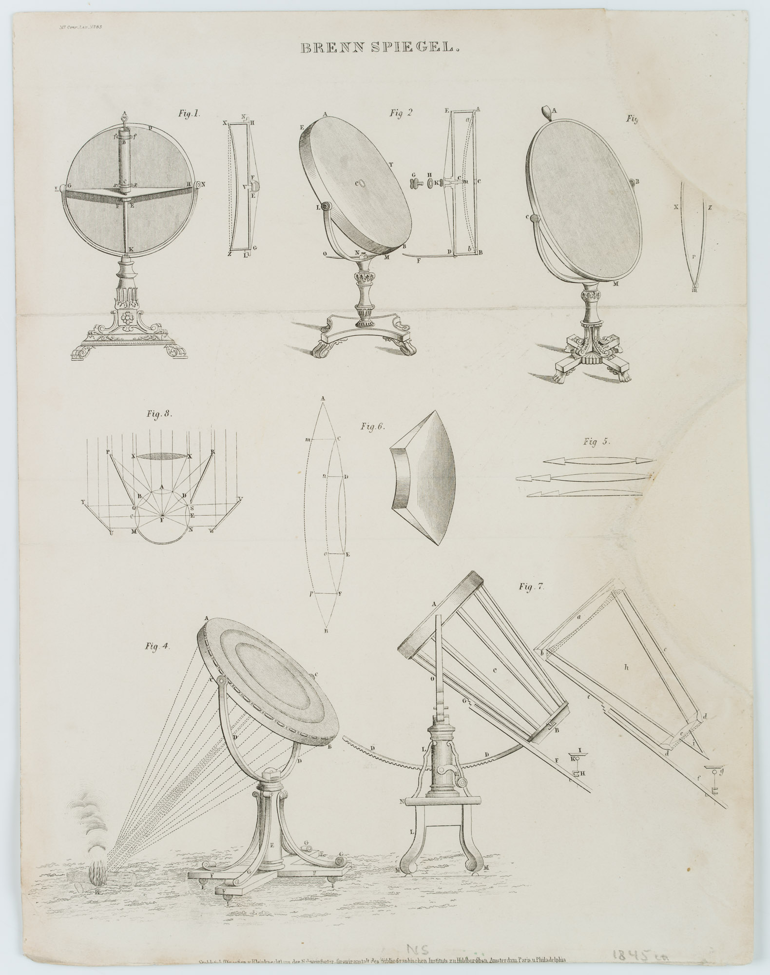 Unbekannt (19. Jahrhundert), Detaildarstellung von Brennspiegeln in verschiedenen Ansichten mit eingezeichneten Brennpunkten, um 1845, Stahlstich