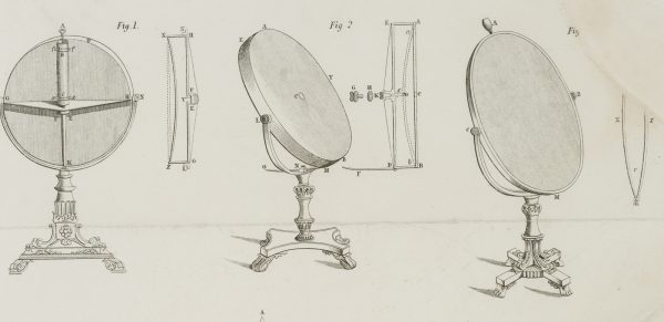 Unknown (19th century), Detailed representation of focal mirrors in different views with drawn focal points, c. 1845, Steel engraving
