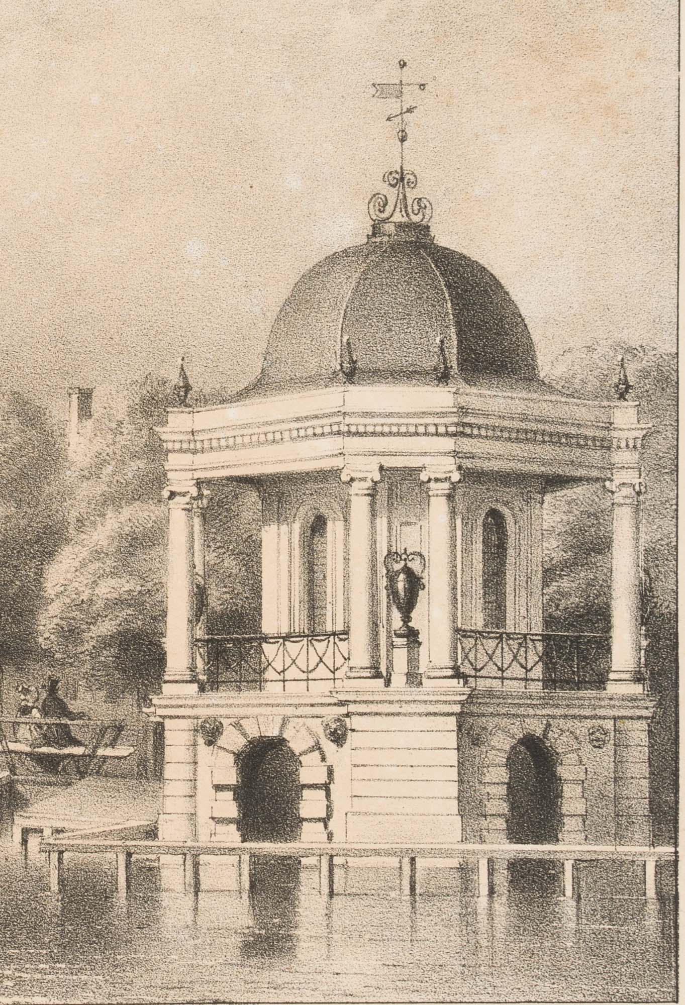 Unbekannt (19. Jahrhundert), Broek in Waterland mit Teehaus auf dem Wasser, Noord-Holland., 19. Jahrhundert, Lithographie