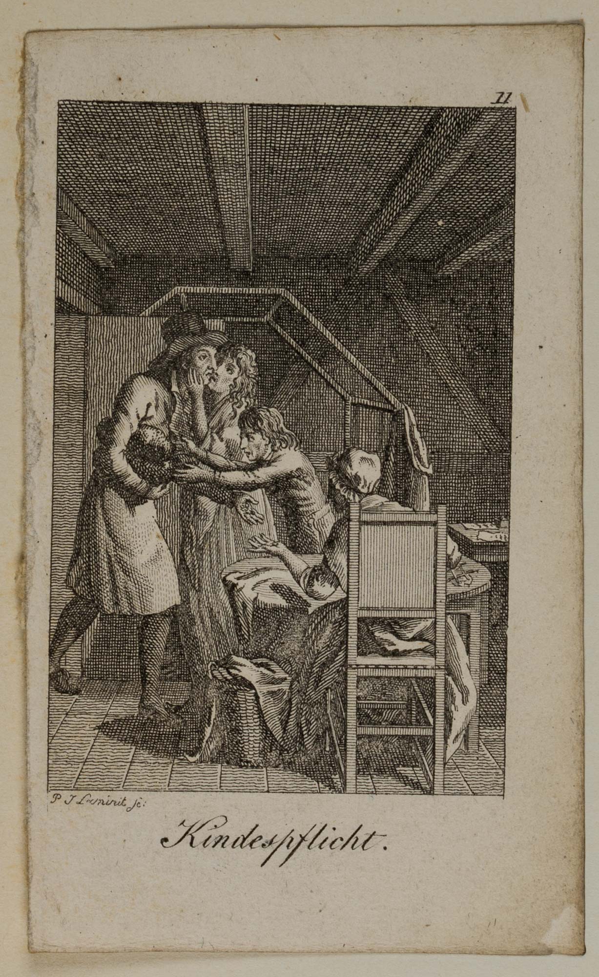 - Description: Miniature and illustration of contemporary literature. Showing a genre scene, with three generations. Signed “P.J. L (?) sc.” below the illustration, titled “Kindespflicht.”.The print comes from the collection of the Munich architect Fritz Hasselmann (1867-1925), with blue collector’s mark “F.H.” on verso, Lugt number L.1012. From the famous house of “Ludwig Rosenthal’s Antiquariat”, Munich.