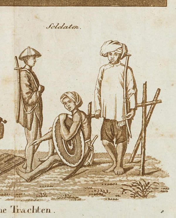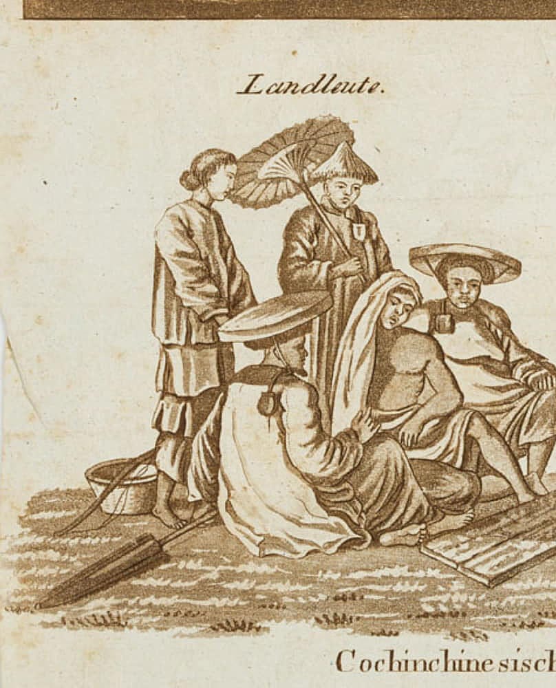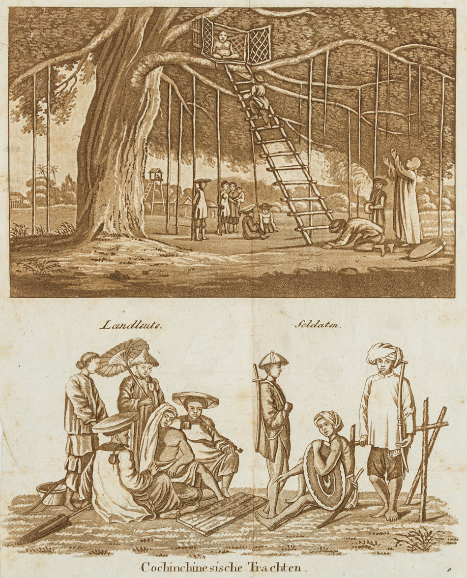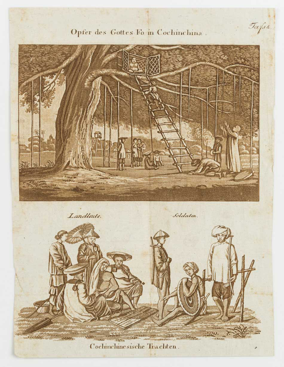 - Bezeichnung: Oben betitelt: “Opfer des Gottes Fo in Cochinchina.” Unten betitelt: “Cochinchinesische Trachten.” Mittig betitelt: “Landleute.” und “Soldaten.”