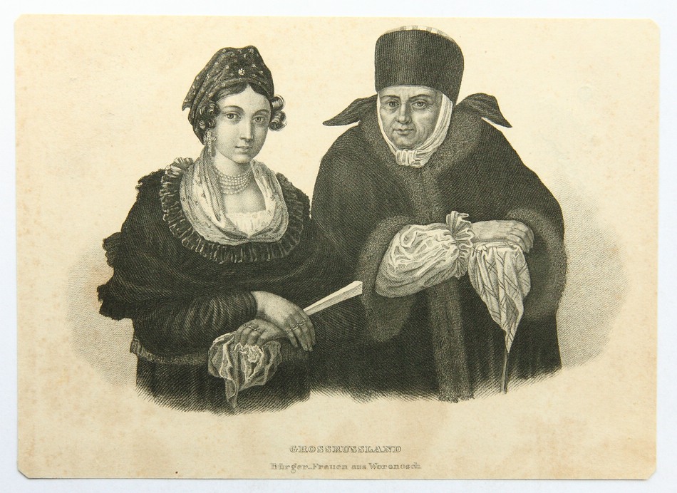 - Bezeichnung: Unterhalb der Darstellung in der Druckplatte betitelt: “Grossrussland Bürger-Frauen aus Woronosch”.