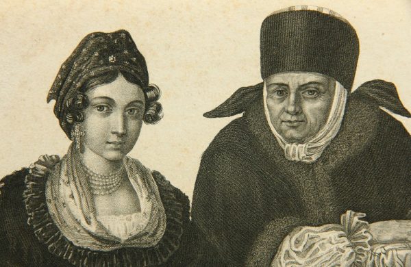 - Description: Half-figure depiction of two nobly dressed women in Russian-influenced costumes. Next to a young woman stands an old lady in a fur coat.